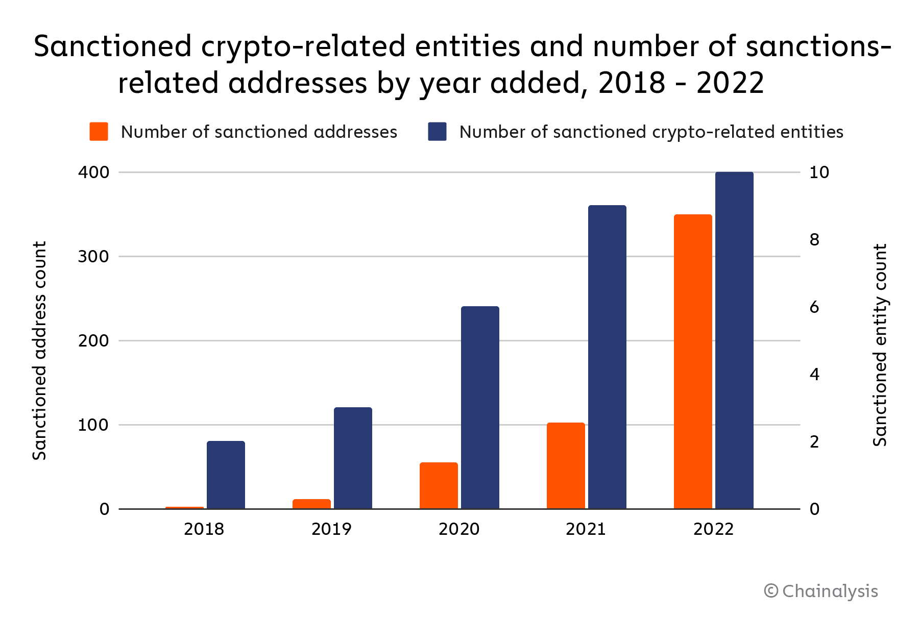 OFAC sanctioned a relatively even mix of individuals and different types of entities in 2022, citing activity such as cybercrime (including ransomware), drug trafficking, money laundering, and in the case of Task Force Rusich, participation in Russia’s invasion of Ukraine. Again, this diversity of entities represents a huge change compared to OFAC’s pre-2021 designations, which were all against individuals and, at the blockchain level, comprised of only a relatively small number of personal wallets.