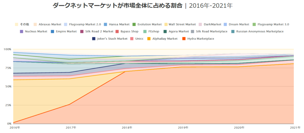 Hydraはロシア語圏だけを対象としているにも関わらず、ここ数年にわたり、突出して規模の大きいダークネットマーケットとなっています。