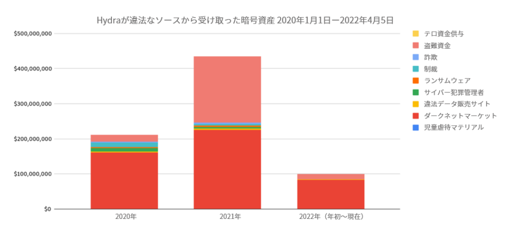 実際に2020年、Hydraは他のダークネットマーケットや、盗難資金を保持したウォレット、ランサムウェアのオペレータ、詐欺などから、6億4,500万ドルに相当する暗号資産を受け取っています。