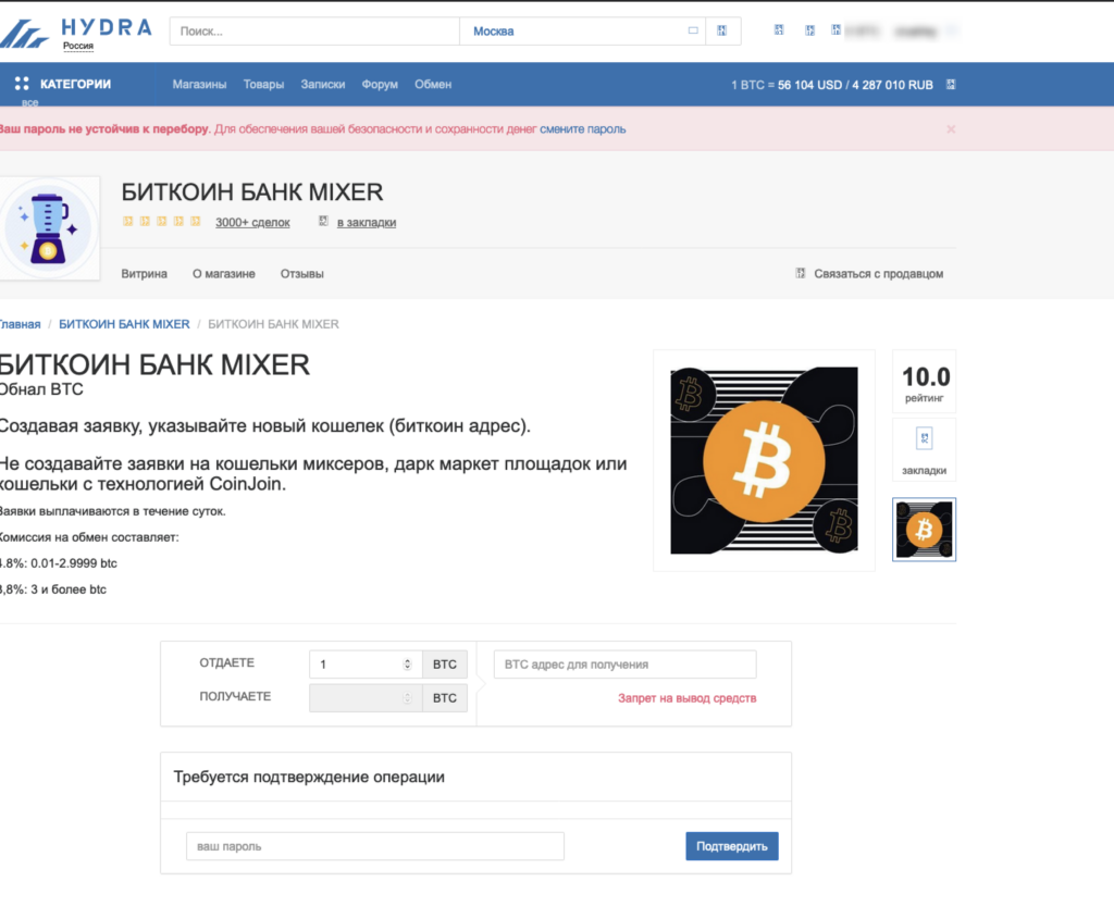 Hydraやそのベンダーは、厳密なコントロールと管理が行われているインフラストラクチャーに備えられた複数の事前承認済みサービスを使って、ベンダーやサイバー犯罪者が暗号資産をロシアルーブルに換金できる、マネーロンダリングサービスを提供しています。