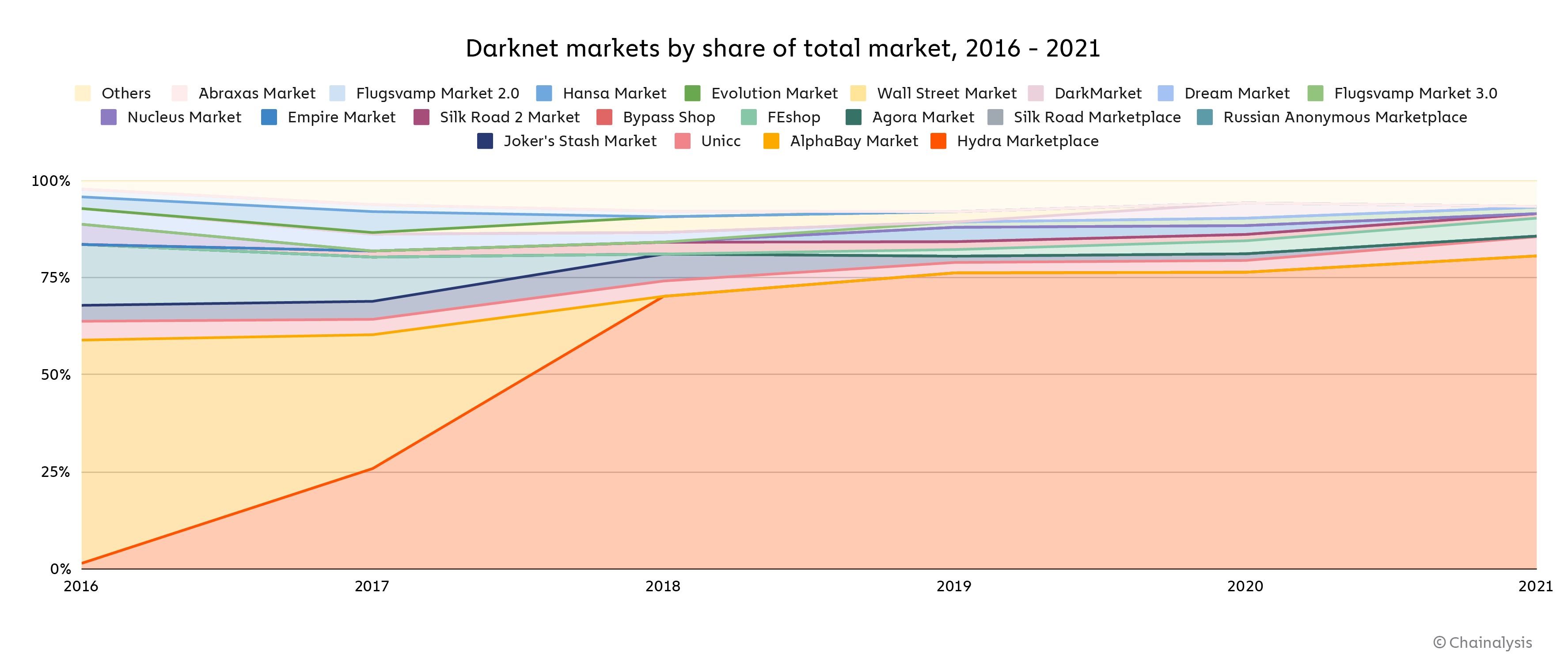 In 2021, Hydra received more than $1.7 billion worth of cryptocurrency, which accounts for over 75% of all darknet market revenue globally.
