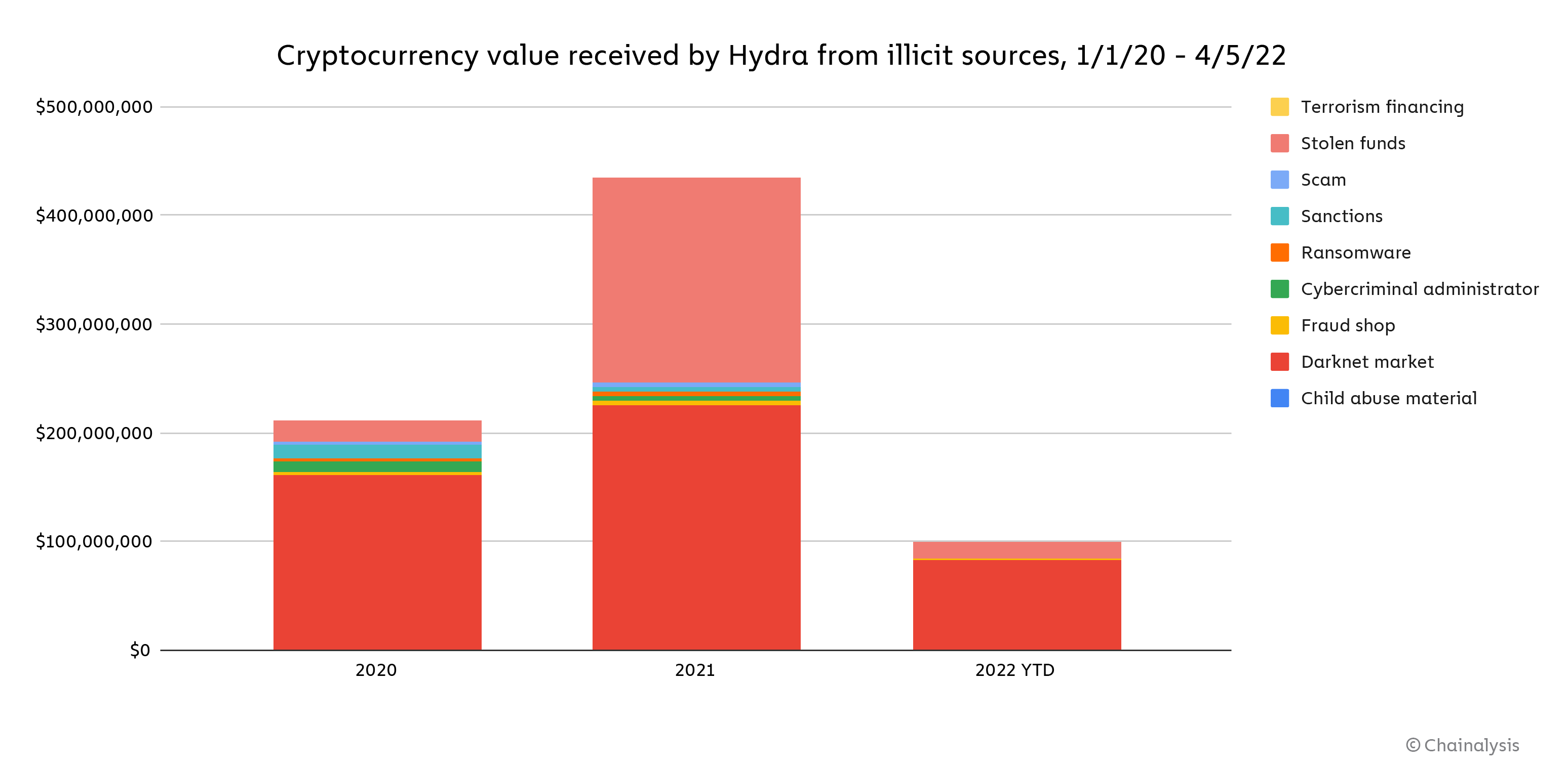 In fact, since 2020, Hydra received $645 million worth of cryptocurrency from illicit sources, including other darknet markets, wallets holding stolen funds, ransomware operators, and scammers — we believe much of this was due to Hydra’s money laundering services.