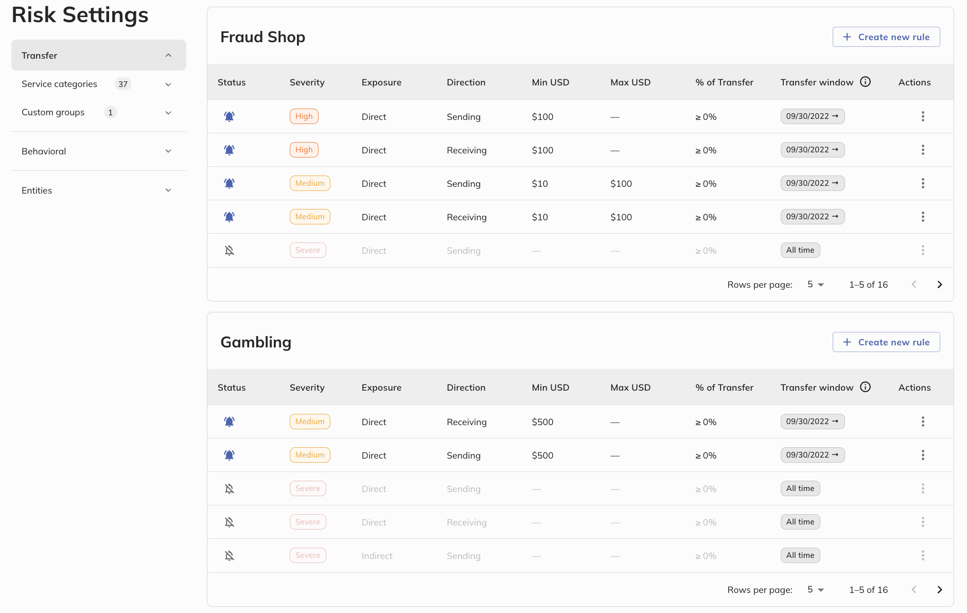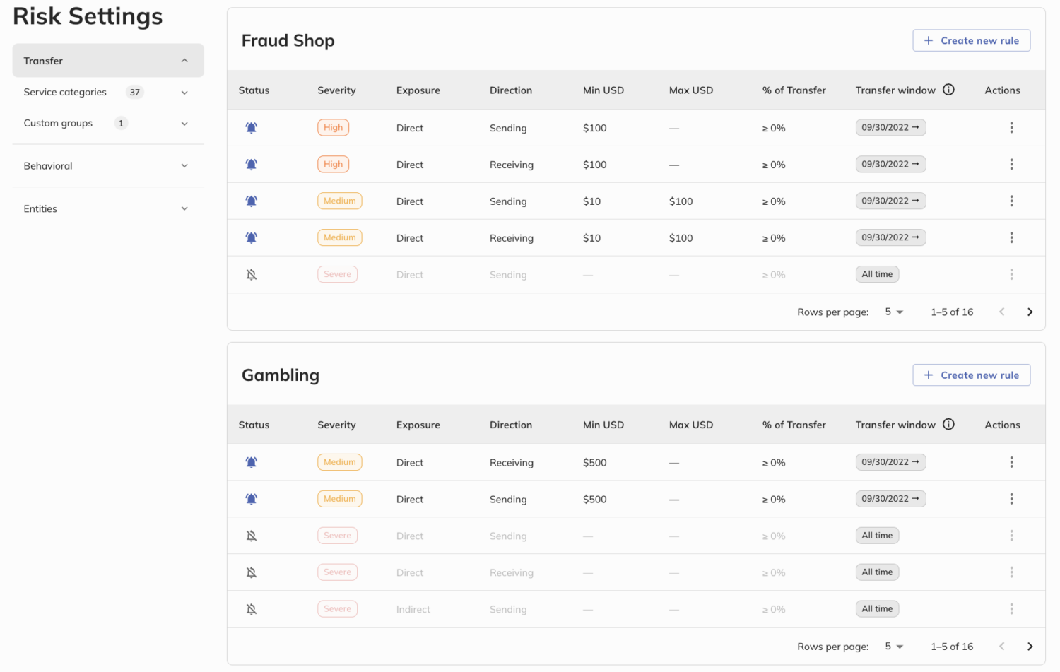 Chainalysis Crypto Compliance Solutions can provide alerts for when users are transacting with risky addresses. Exchanges are able to configure flexible risk rules across category thresholds, custom groups, and behavioral activities that create alerts for teams to review.