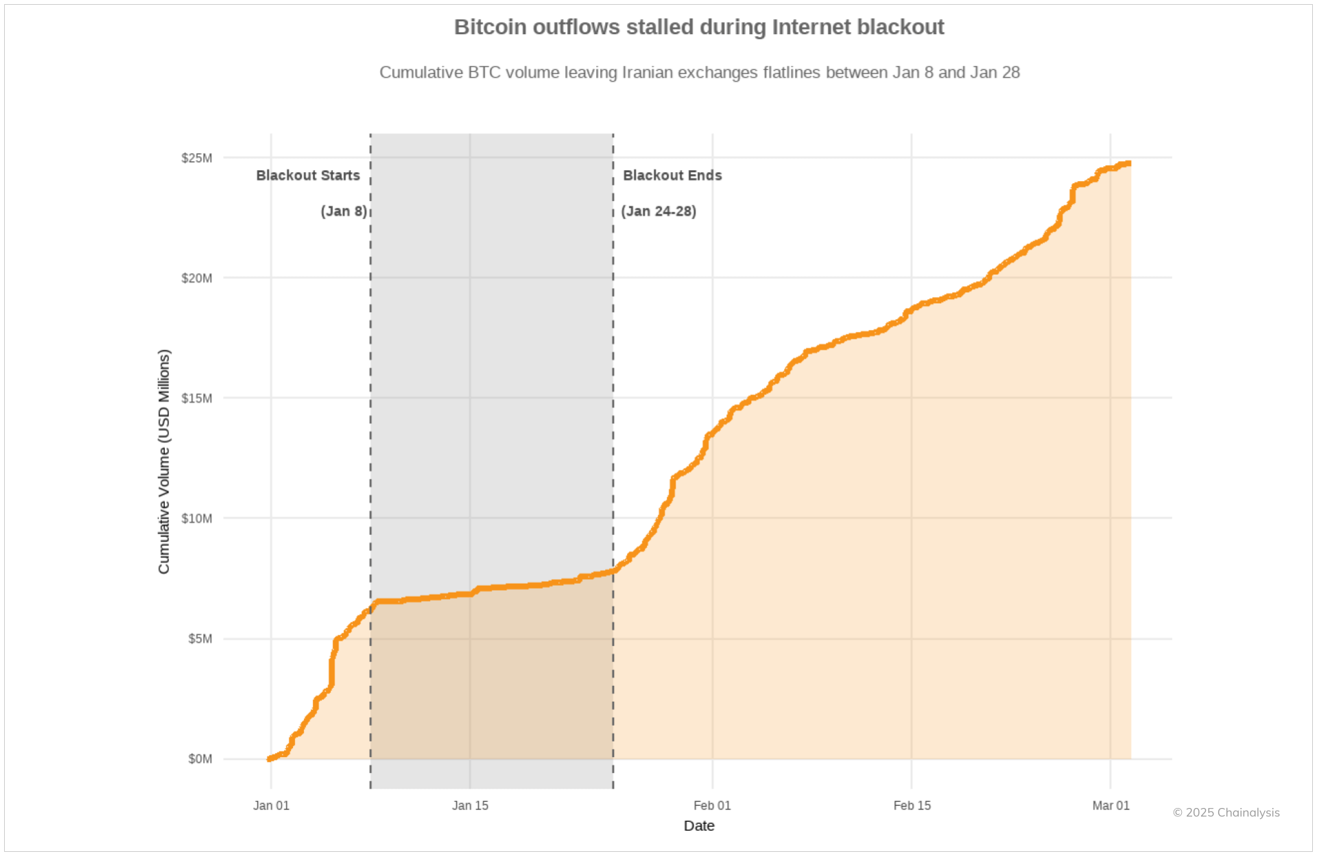 We also documented how Bitcoin withdrawals from Iranian exchanges to personal wallets surged during the most recent protest wave, as citizens sought a self-custodial hedge against economic instability and potential crackdowns — until authorities imposed a blanket internet blackout that restricted access to centralized platforms.