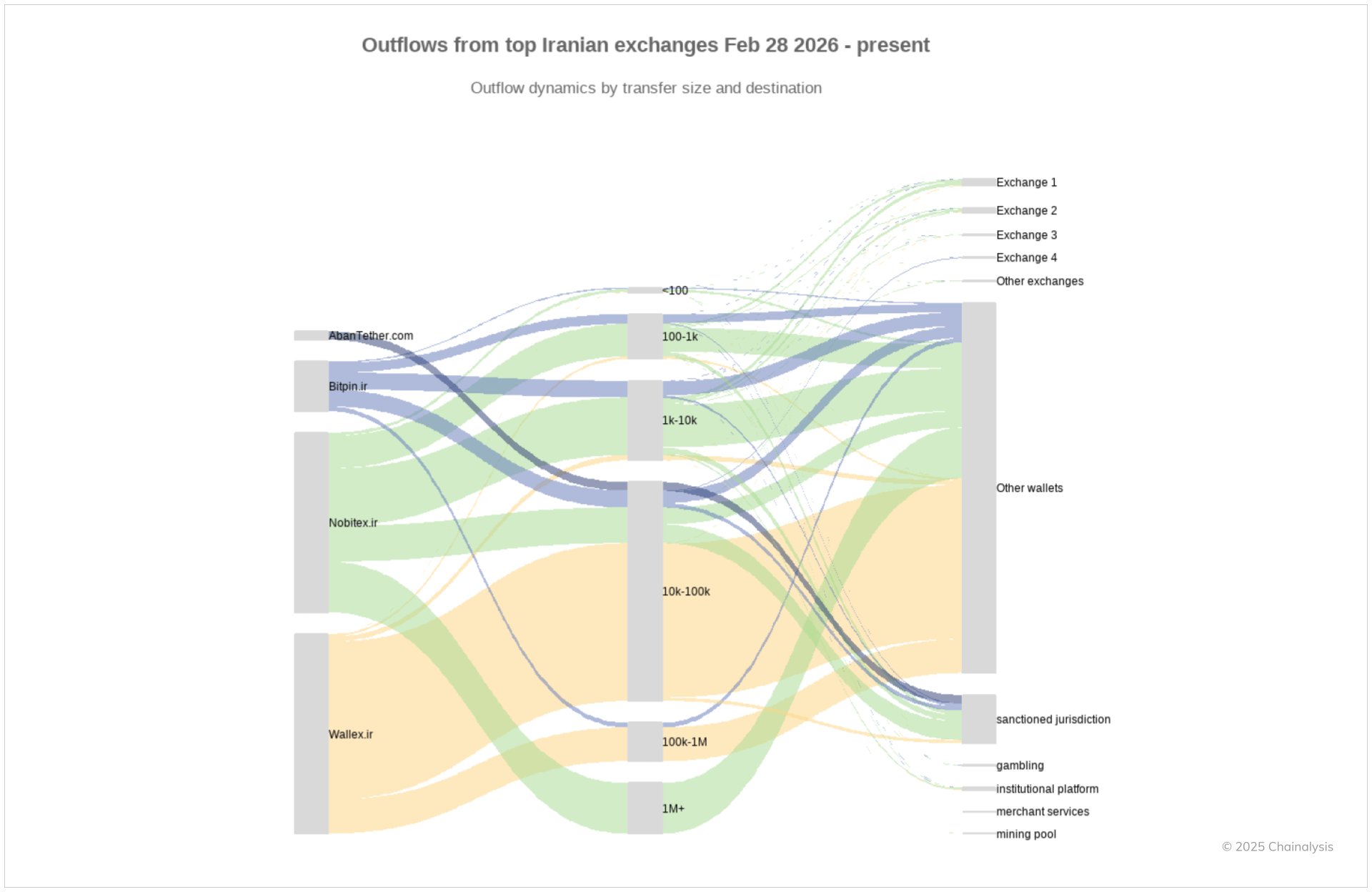 On the left, we see several of Iran’s largest platforms as the origin points for transfers. In the middle, flows are grouped into size buckets (from sub-$100 transfers up to transfers above $1 million), and on the right, we see where those funds go by category. As expected, there are significant outflows to overseas mainstream exchanges, as well as to other domestic Iranian exchanges. Notably, a substantial share of outflows land in “other wallets,” which could include a combination of three plausible explanations: