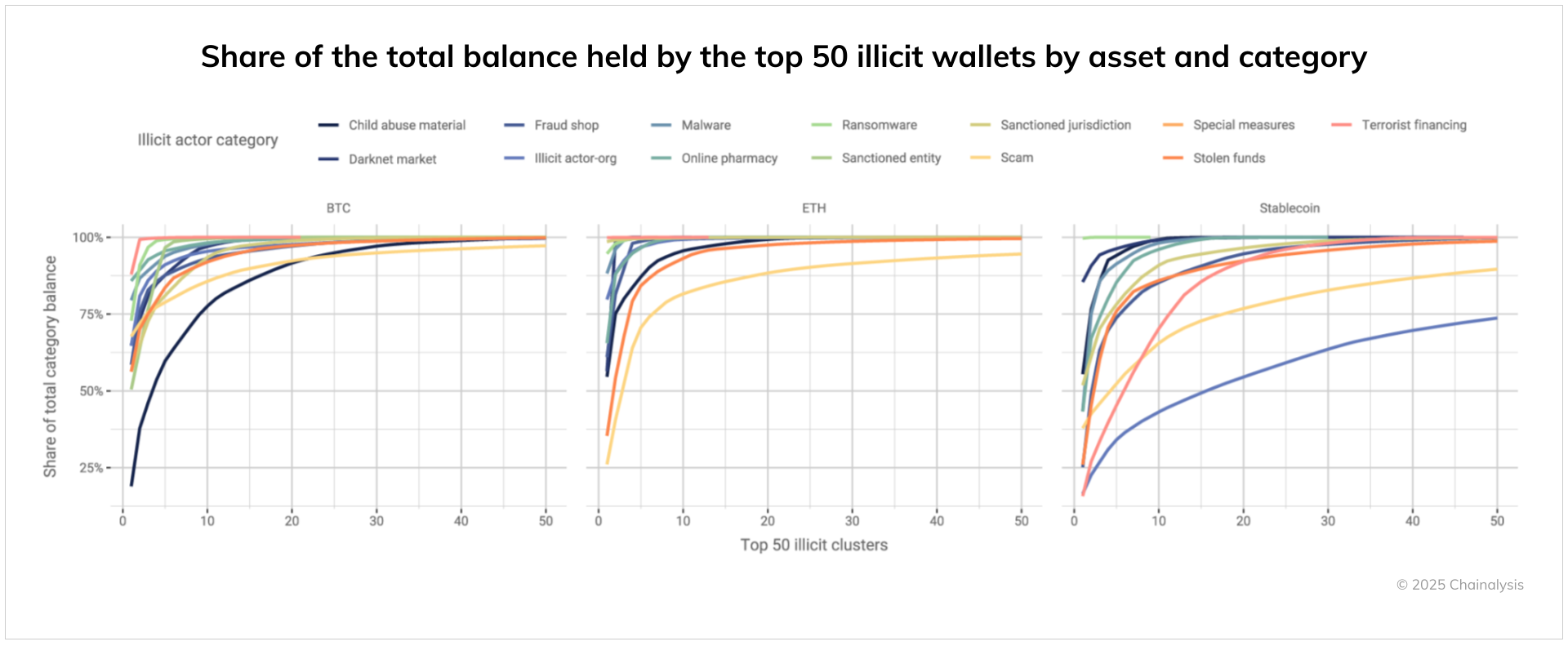 Asset type adds another dimension to concentration patterns. Stablecoins consistently show less concentration than BTC or ETH across categories. This likely reflects a degree of risk management by criminals — stablecoins can be frozen by centralized issuers if linked to illicit activity, incentivizing criminals to spread holdings across more wallets to minimize potential losses from any single point of failure. Additionally, they may be incentivized to convert stablecoin balances either to fiat or other permissionless assets, such as bitcoin.