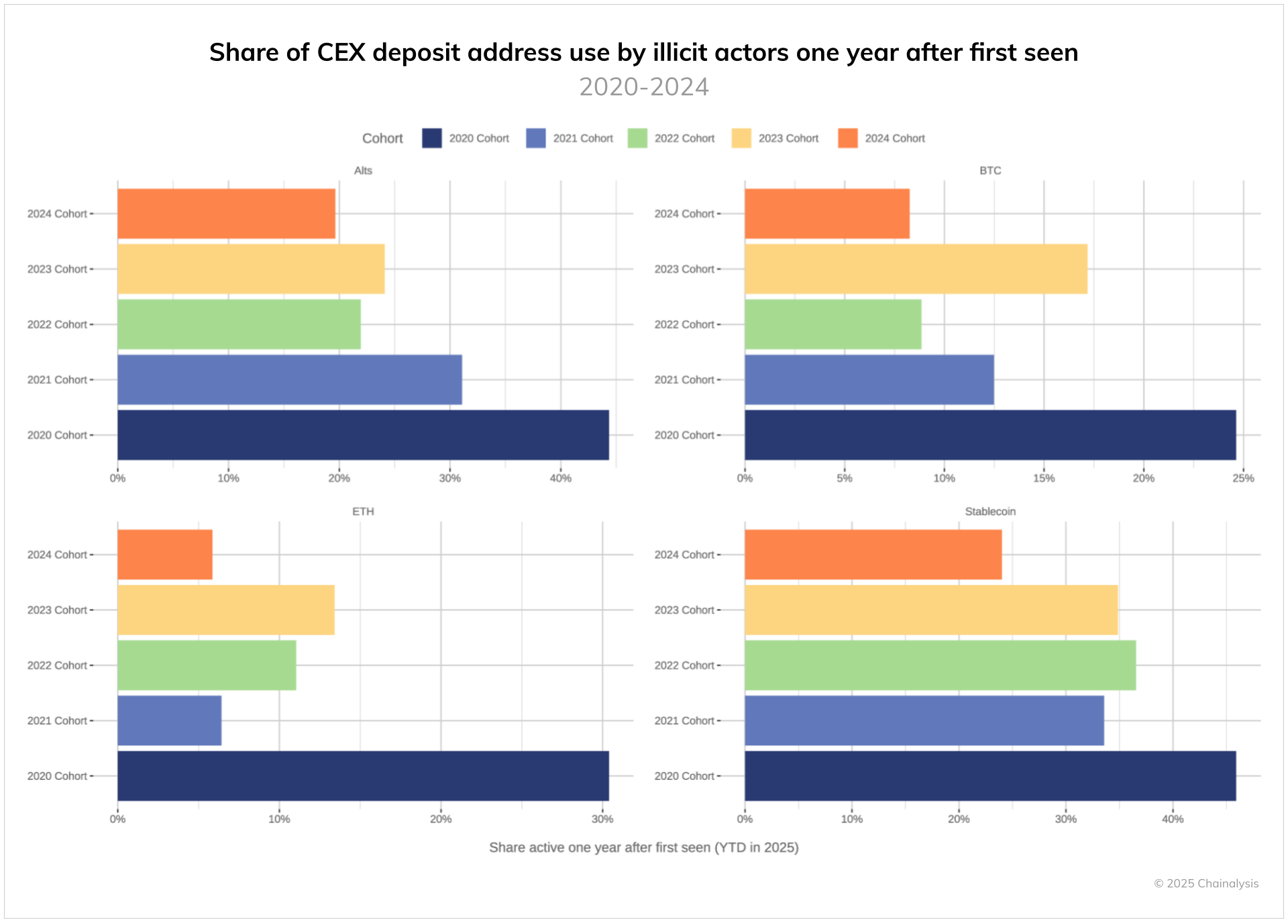 For addresses first used in 2020, between 24% and 46% were still being used to cash out illicit funds one year later, with some variation depending on the asset. This relatively high reuse rate suggests that illicit entities found stable cash-out infrastructure during this period and reused that infrastructure repeatedly. However, for more recent cohorts, reuse rates have trended downward. The implication is that rather than re-using specific exchange accounts, criminal cash-out infrastructure now turns over at a higher rate than before, potentially in an effort to evade CEX compliance efforts.