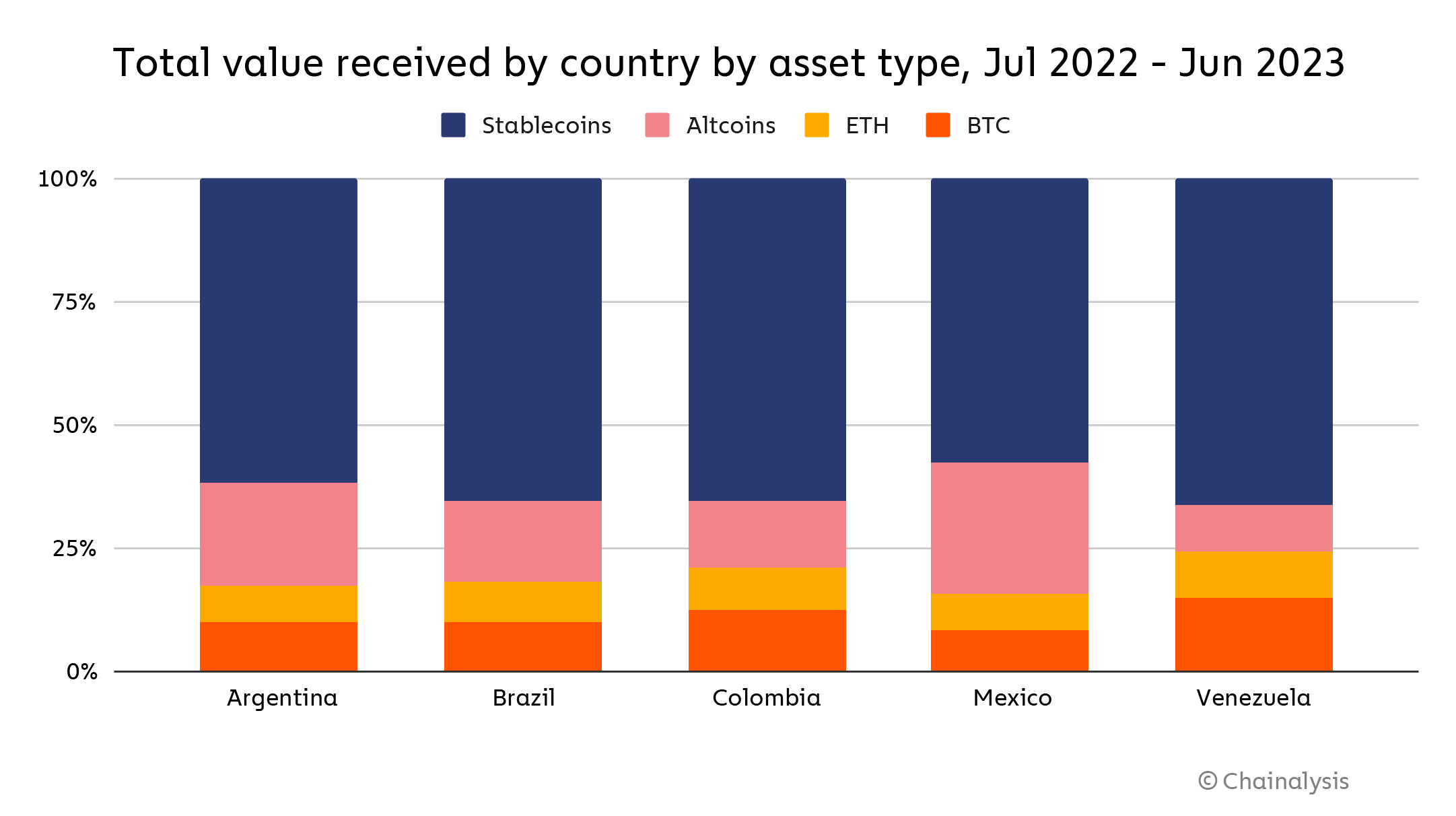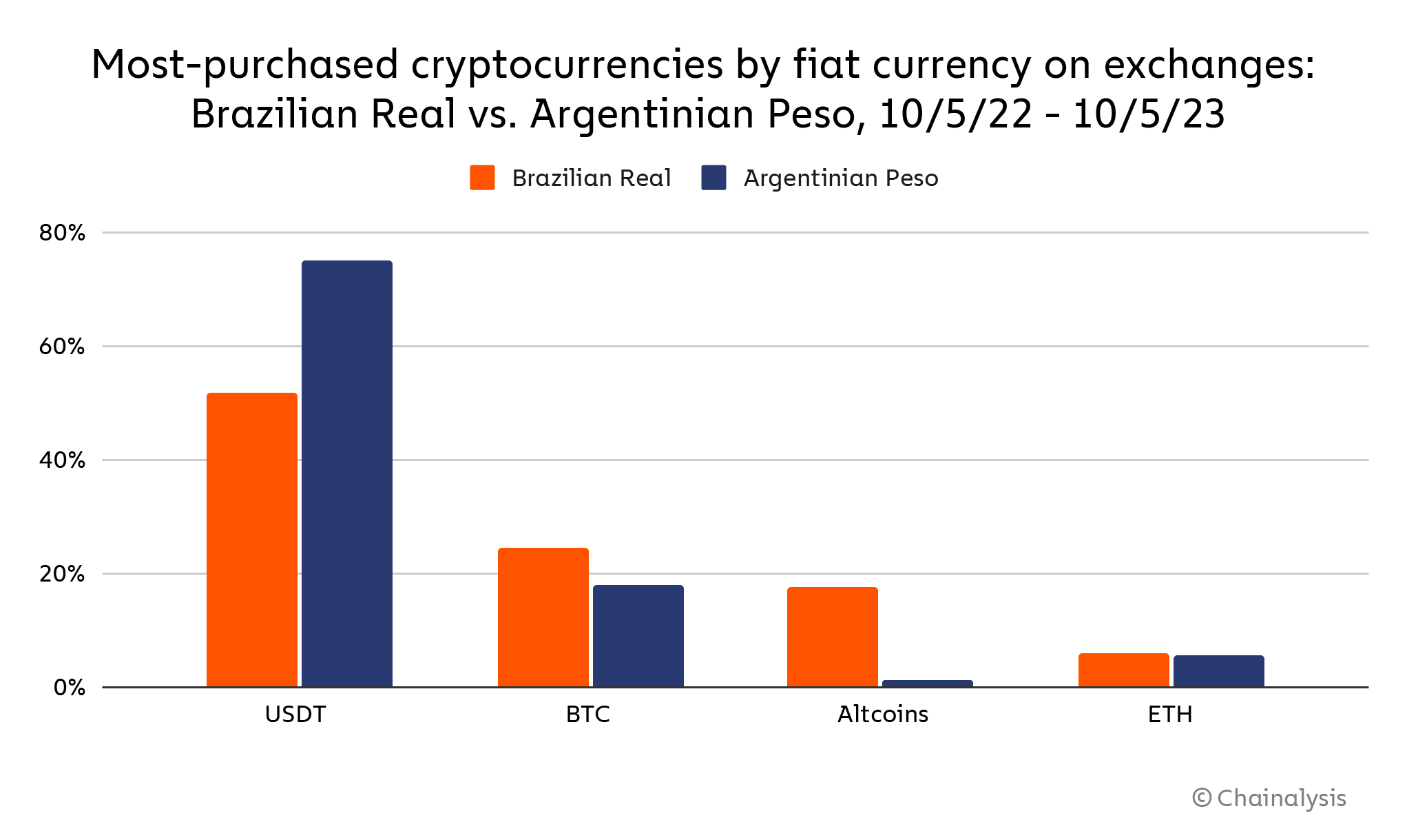 The data suggests that demand for the stablecoin USDT is much higher in Argentina than in Brazil — as we explore in detail below, this is almost certainly due to the currency devaluation Argentina has faced of late. Meanwhile, Brazilians display a higher demand for Bitcoin and especially altcoins, which are more typically used for long-term investment and speculation.