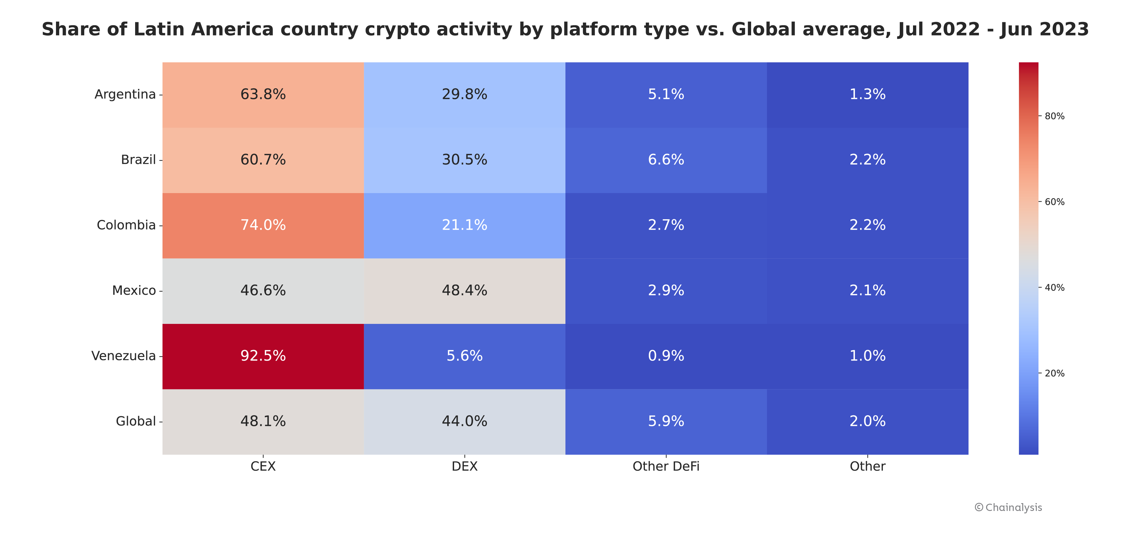 There’s significant variation in crypto usage patterns among countries in Latin America. Check out the heat map below, which compares a few of the region’s biggest crypto-using countries by preferred platform type.