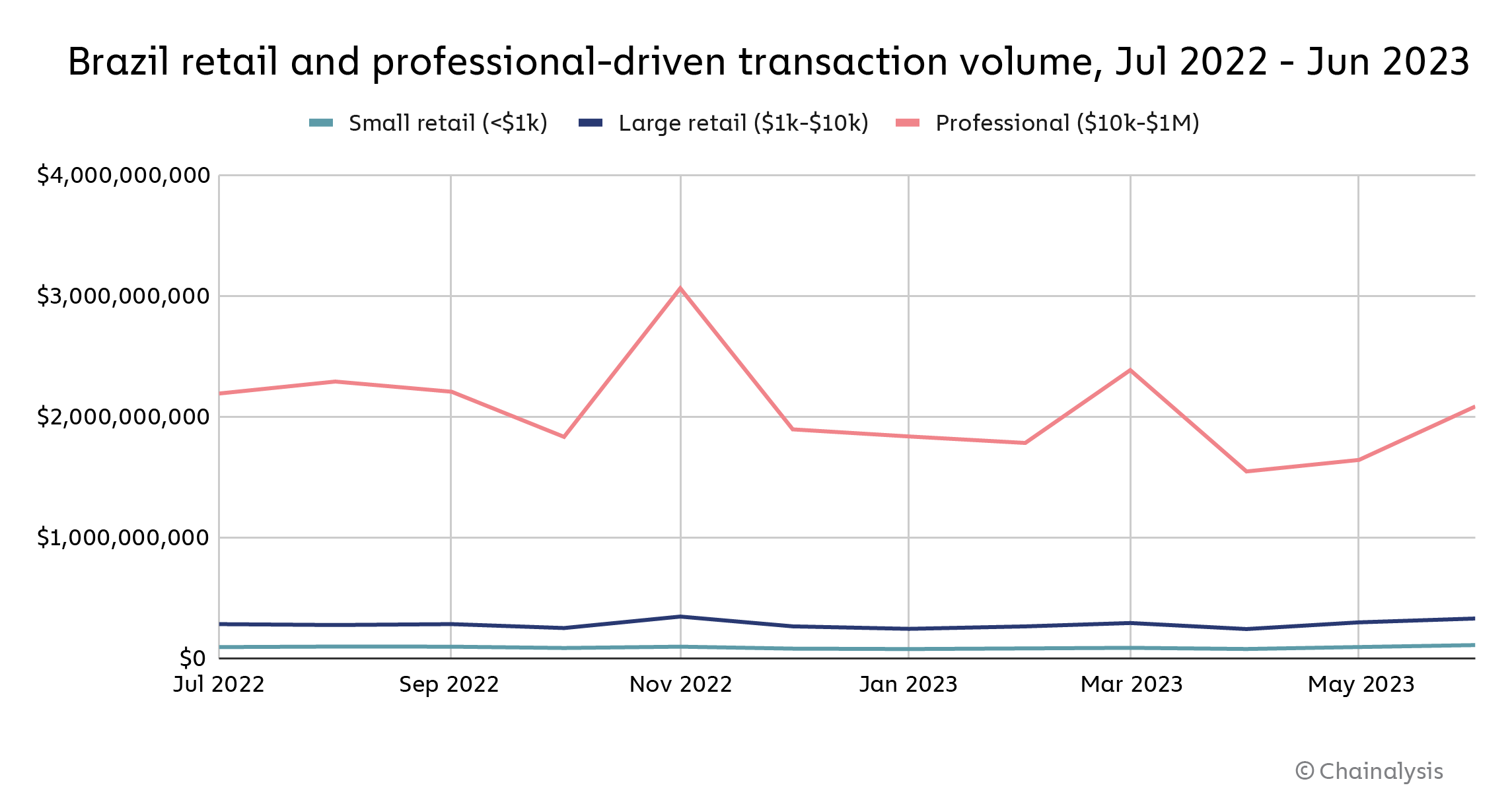 However, there are still some positive takeaways for Brazil’s crypto enthusiasts. For one, while large institutional transactions generally trended down, they appear to be picking back up, with three straight months of growth through June. In addition, even in the months where the decline in large institutional transfers drove overall declines in crypto activity, professional and retail-sized transaction volume stayed relatively even. This is more obvious as expressed on the line chart below.