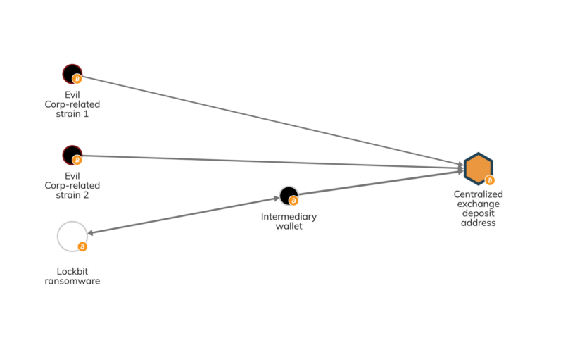 Here, we see Lockbit and two other strains that have been identified as Evil Corp rebrands sending funds to the same exchange deposit address.