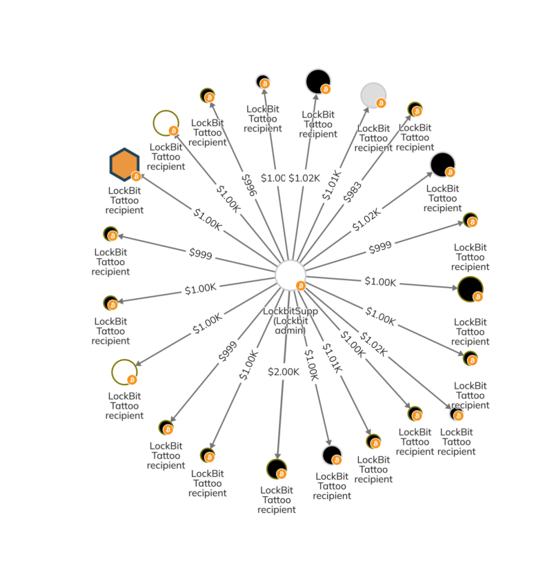 At times, Lockbit’s administrators engaged in publicity stunts whose value appears questionable in comparison to their risk to the group’s operational security. For example, in 2022, a Lockbit administrator known by the online handle LockBitSupp announced that they would pay $1,000 to anyone who got a tattoo of the Lockbit logo. Analysis of LockBitSupp’s on-chain activity during this time period suggests that, shockingly, many took them up on the offer. We can see some of these payments on the Chainalysis Reactor graph below.