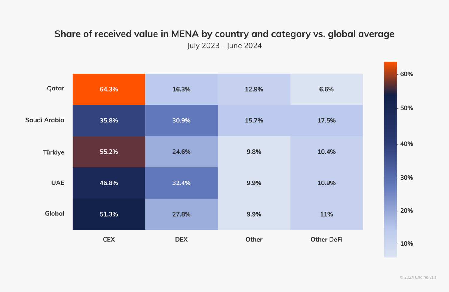 Centralized exchanges (CEXs) remain the primary source of crypto inflows across MENA overall, indicating that most users and institutions still prefer traditional crypto platforms, but decentralized platforms and DeFi applications are steadily gaining traction, as seen in the heatmap below.