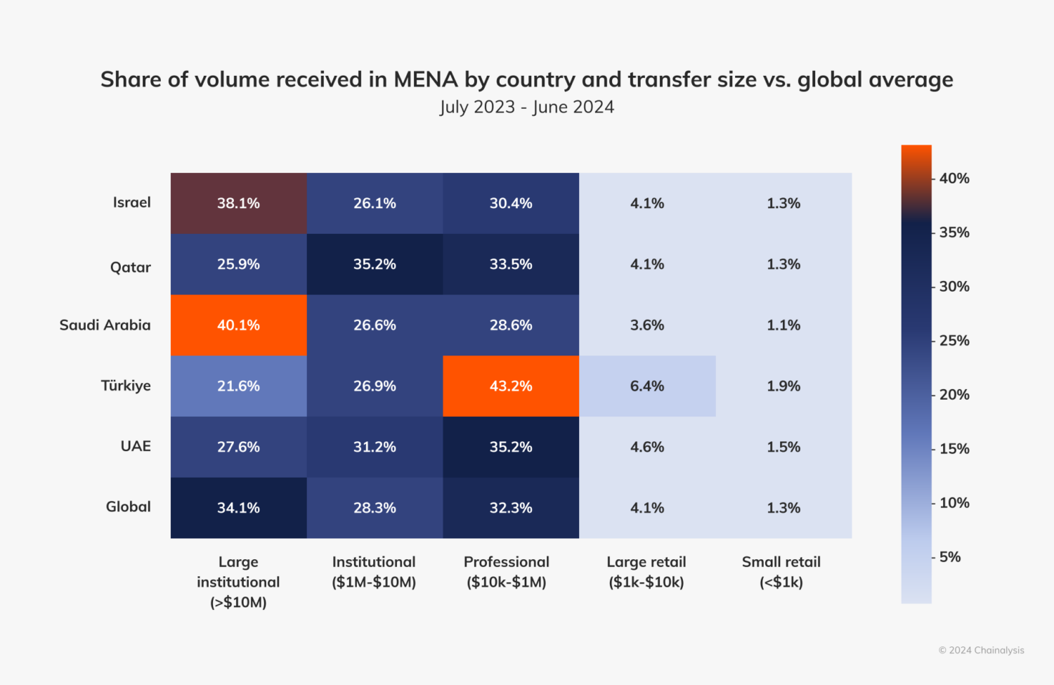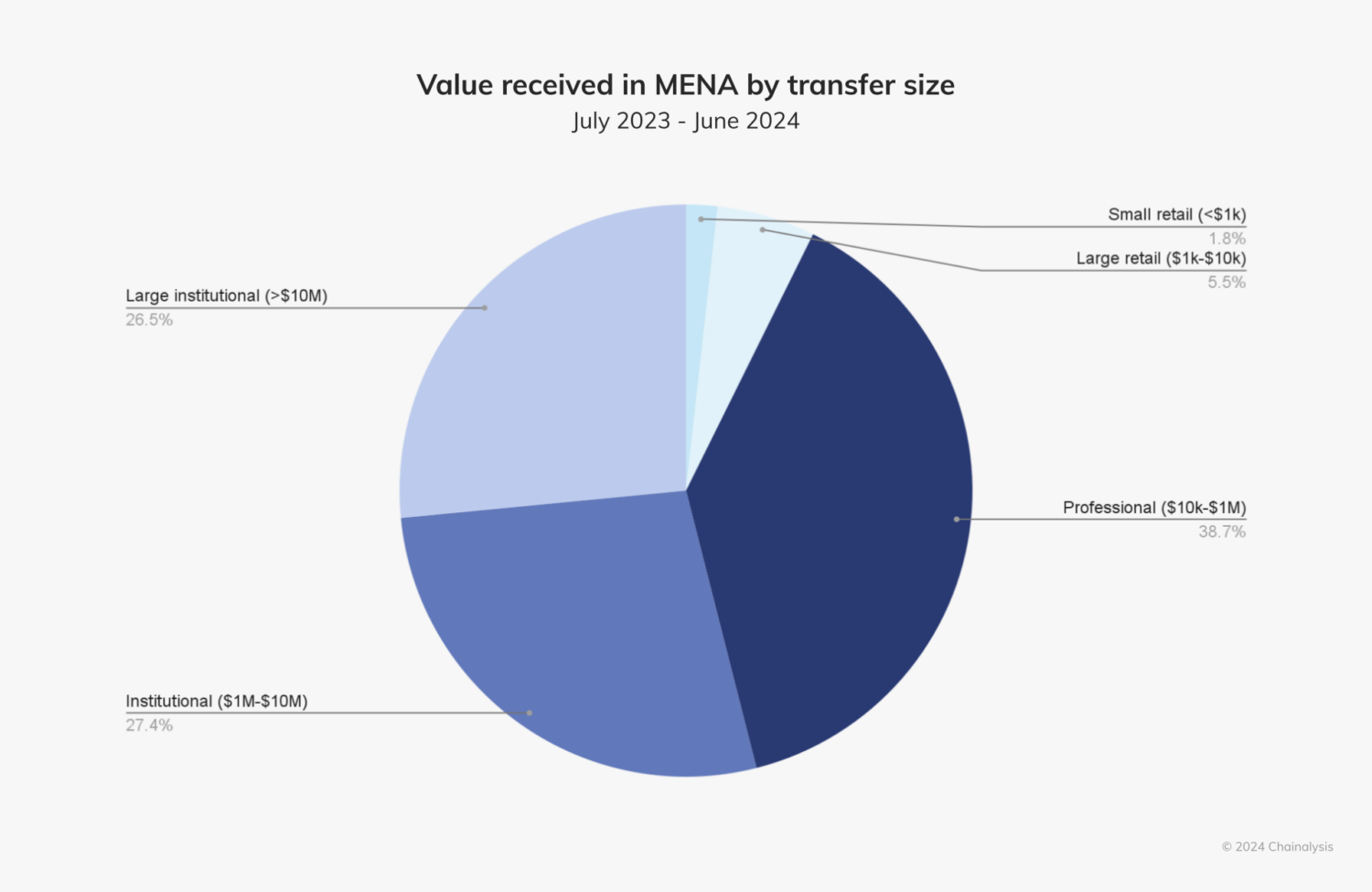 The majority of crypto activity in MENA is driven by institutional and professional-level activity, with 93% of value transferred consisting of transactions of $10,000 or above.