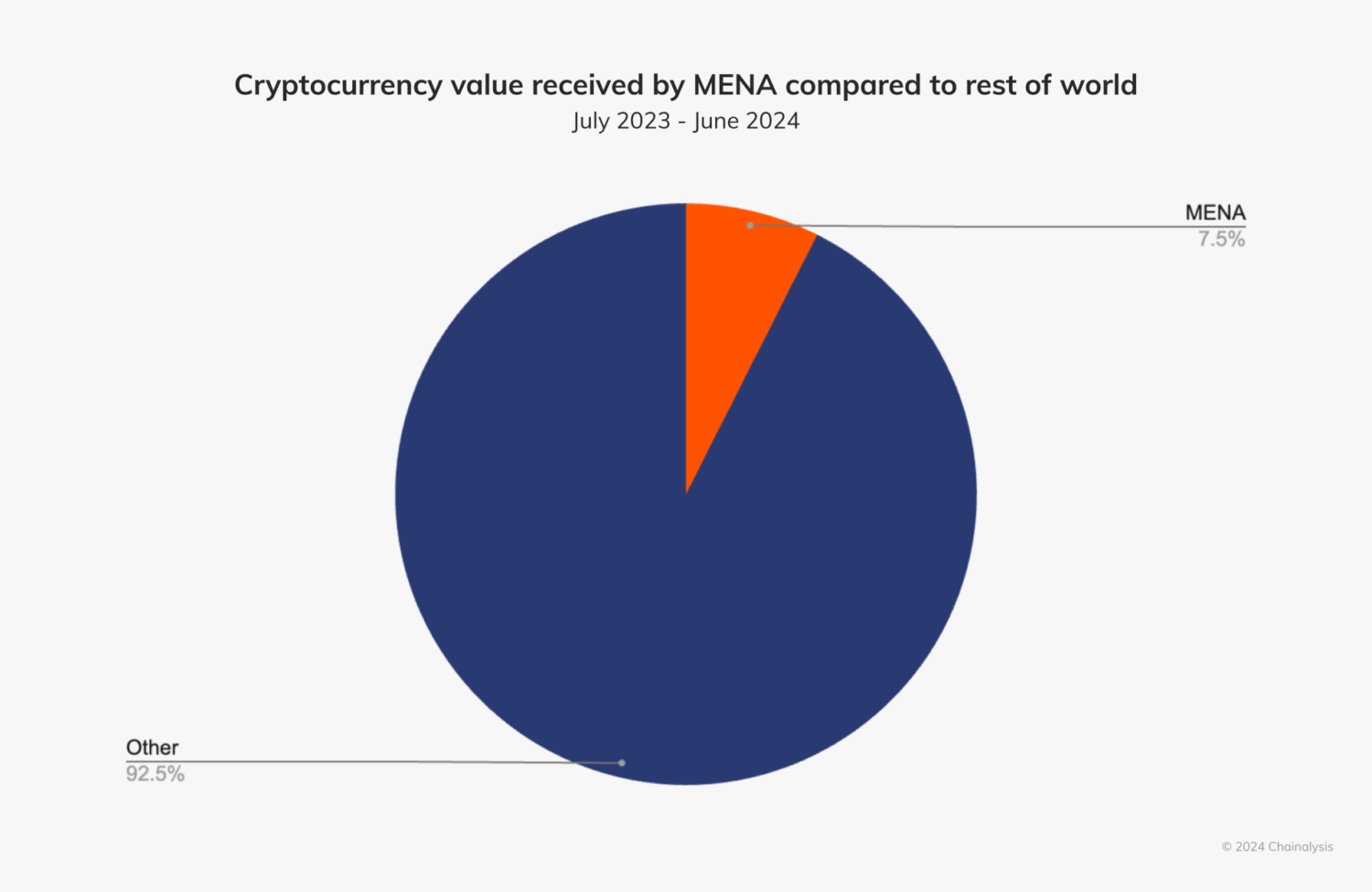 The Middle East & North Africa (MENA) region ranks as the seventh-largest crypto market globally in 2024, with an estimated $338.7 billion in on-chain value received between July 2023 and June 2024, accounting for 7.5% of the world’s total transaction volume.