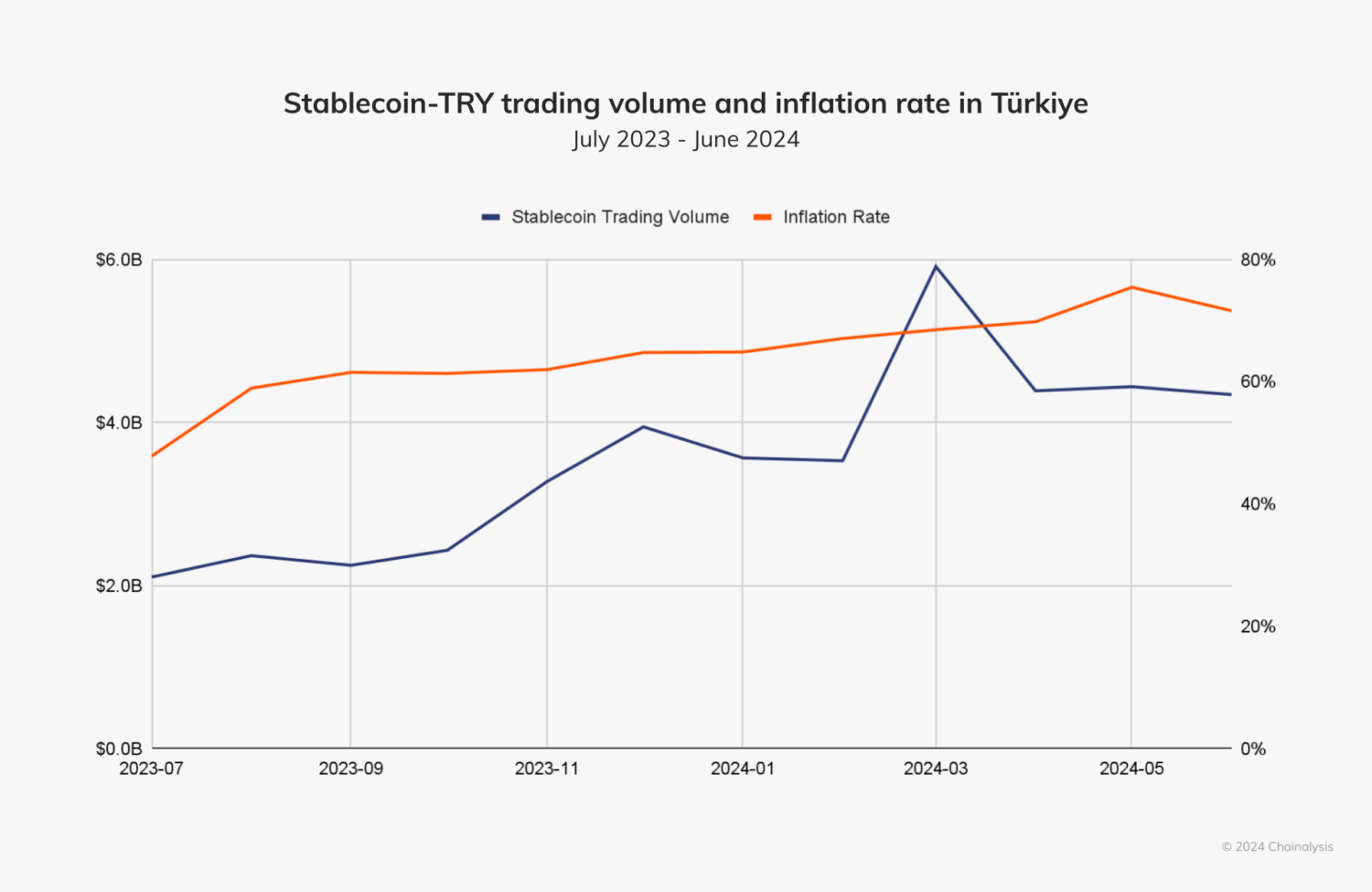 Additionally, as we covered in last year’s report, Türkiye’s high inflation rate, which has hovered near or above 50% for the past year, has driven much of the country’s crypto adoption. Amidst this high inflation, citizens have turned to cryptocurrencies — particularly stablecoins and altcoins — to hedge against currency devaluation and seek higher returns.