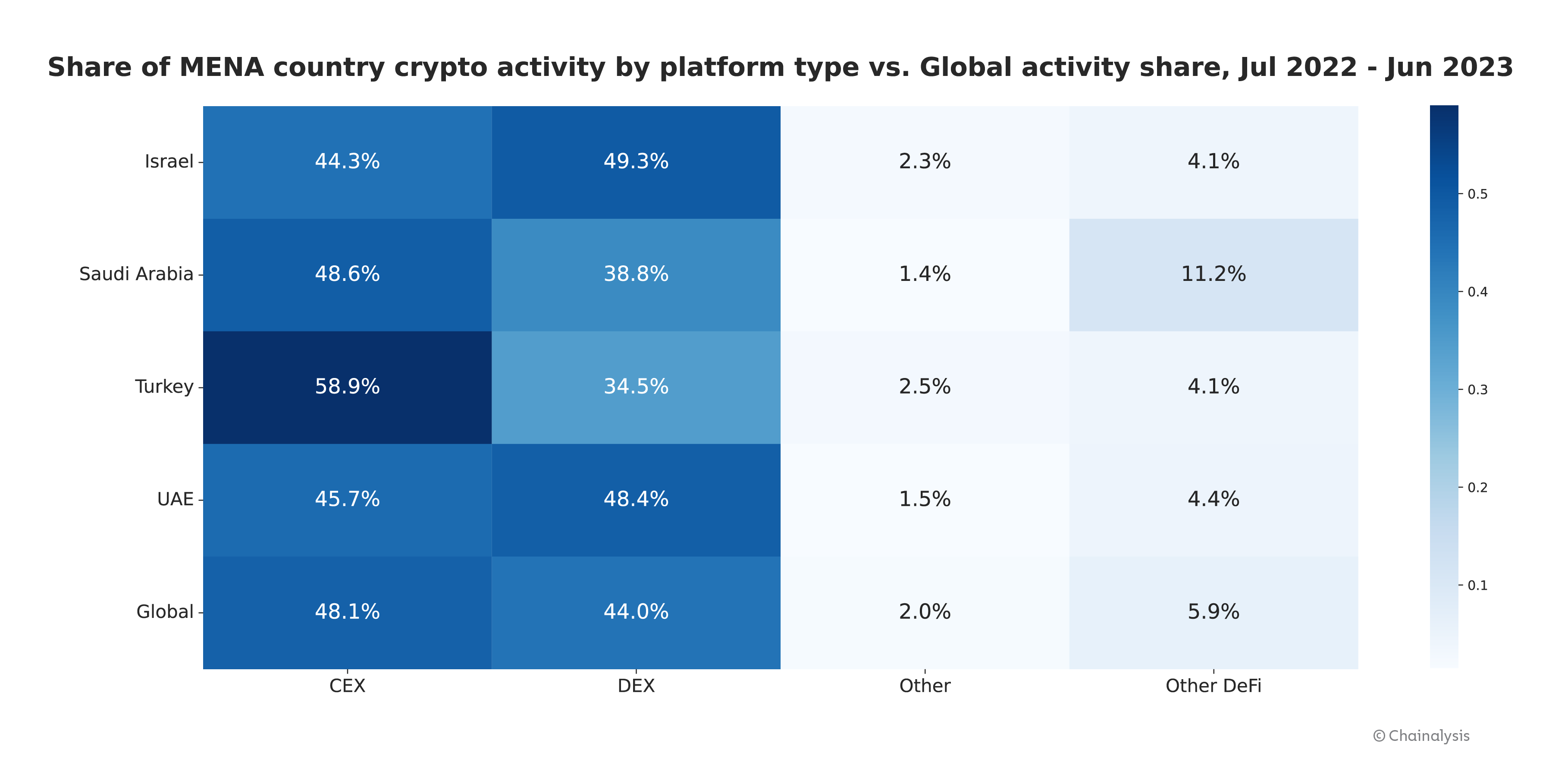 However, we see significant differences between countries within the region. Check out the heat map below, which compares some of MENA’s top crypto economies’ activity by platform type over the last year.
