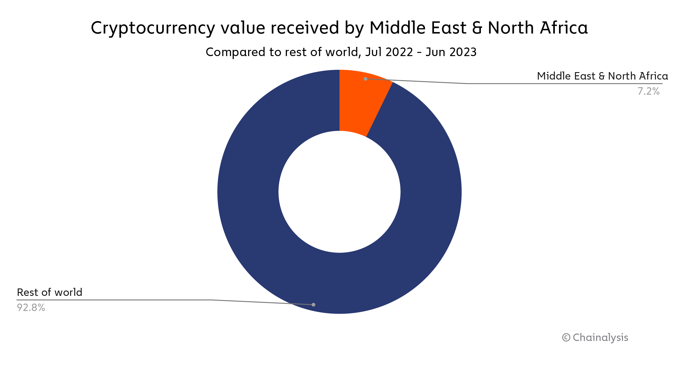 The Middle East & North Africa (MENA) has the sixth largest crypto economy of any region we study this year, with an estimated $389.8 billion in on-chain value received between July 2022 and June 2023. This represents nearly 7.2% of global transaction volume during the period studied.