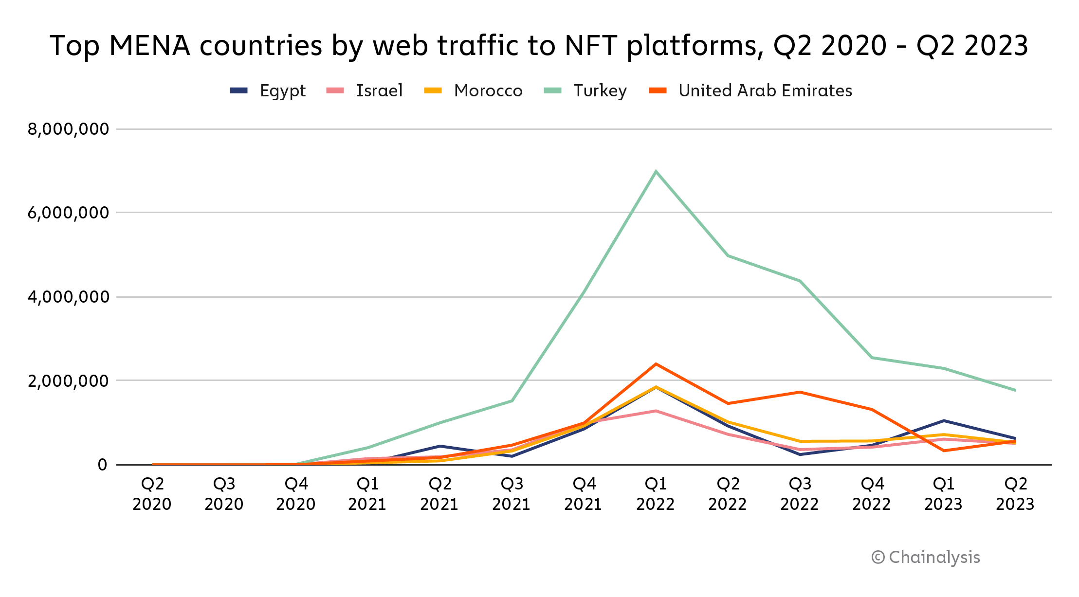 However, Turkey doesn’t devote all of its crypto activity to stablecoins. A broader analysis reveals that Turkey is the top country in the region by web traffic to NFT platforms, despite the overall decline in NFT activity since mid-2022.