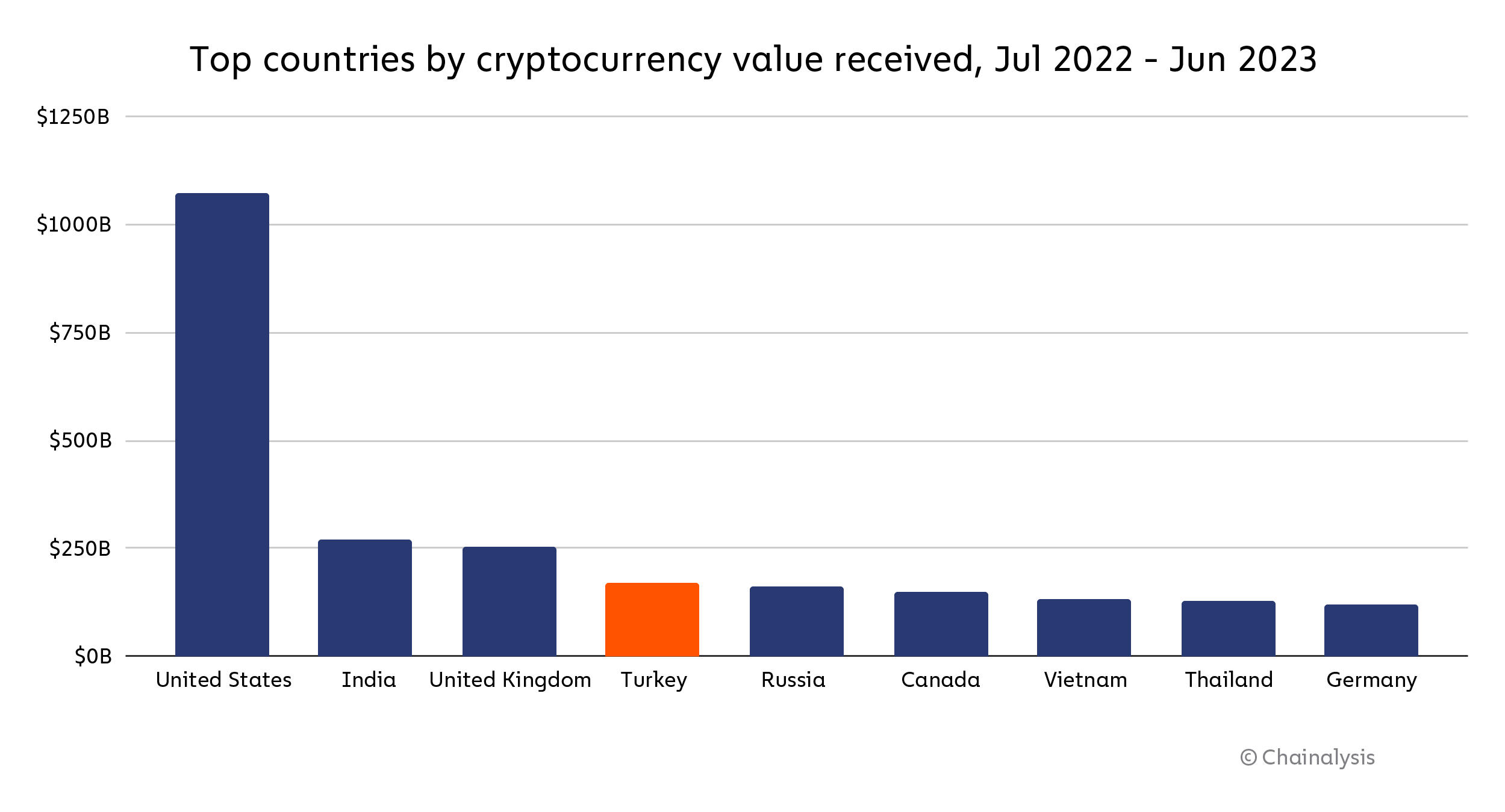 In addition to ranking 12th on our Global Crypto Adoption Index, Turkey is also fourth worldwide in raw crypto transaction volume, receiving approximately $170 billion over the last year. That puts it behind only the United States, India, and the United Kingdom.