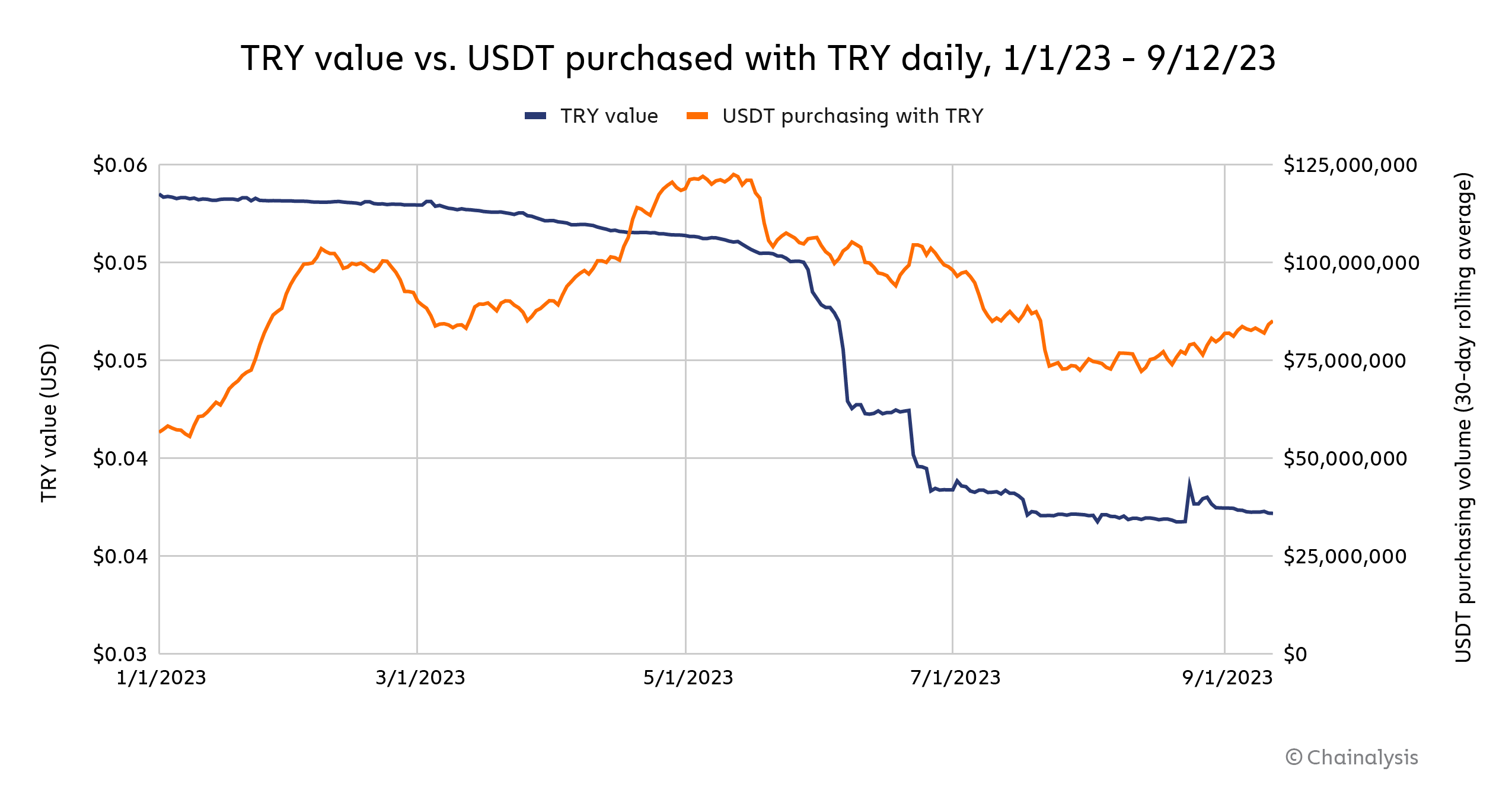 Indeed, Turkey has been facing rising inflation, which reached nearly 60% in August 2023. Additionally, the Turkish Lira crashed in 2021 after the central bank cut interest rates by 100 basis points. Since then, the Lira hasn’t recovered — in fact, it reached record lows in mid-2023. We can see evidence of Turkish currency devaluation driving interest in crypto on the chart below, which shows the value of the Turkish lira versus USDT purchasing volume in Turkish lira across several exchanges. There was one big buying spike starting around March 30, when analysts announced that they expected the lira to fall significantly in value, regardless of who won the country’s May elections, at a time when the currency was already weakening. After a sustained decrease, USDT buying picked up again in late July, soon after the lira hit a new low of under $0.04 in value and citizens awaited a central bank announcement on interest rates. Keep in mind too that our figures for UDST purchasing in lira are displayed as a 30-day average, which can add a slight delay in the pickup of new trends.