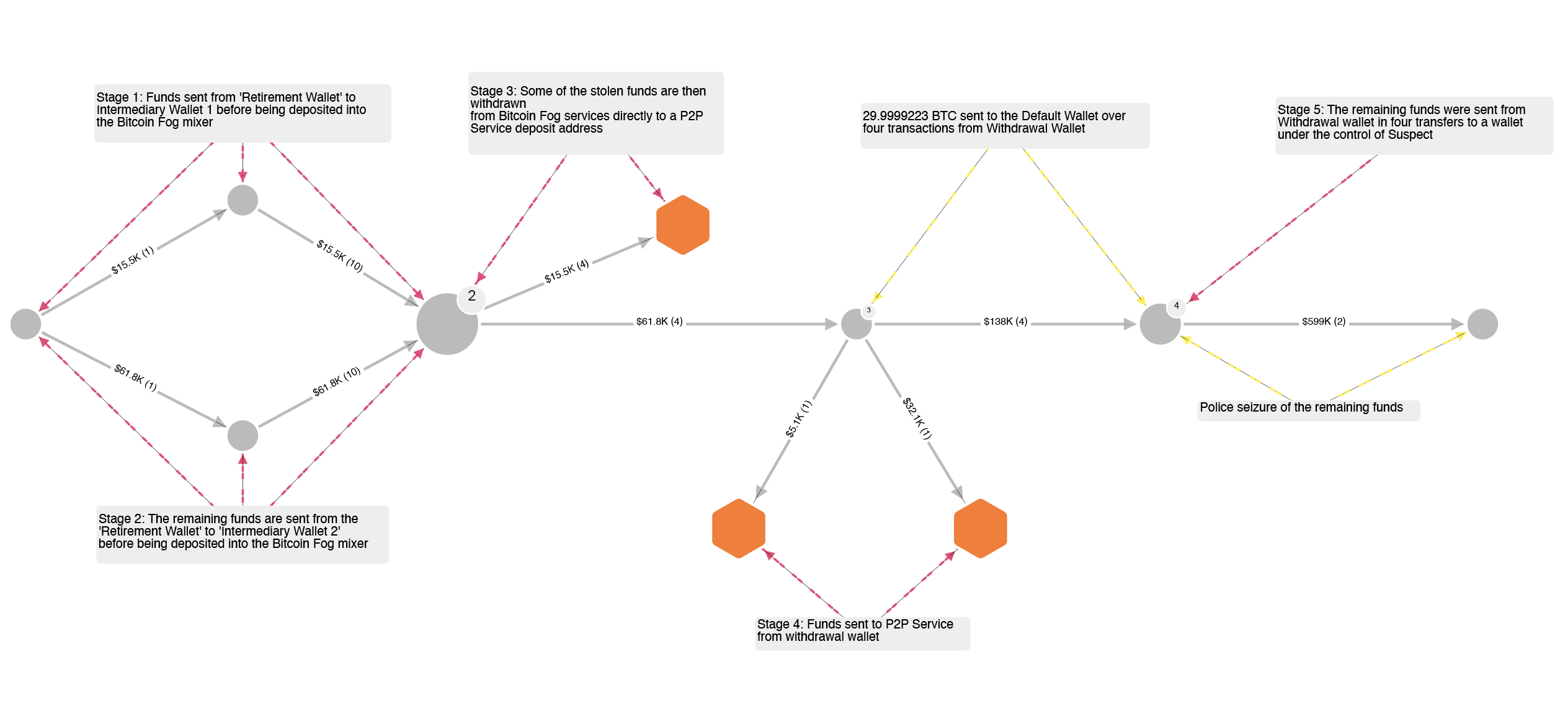 2022年、Merseyside Police(マージーサイド警察)は、Whiteに属していた50 BTCに関する捜査を開始しました。長年、暗号資産のアンダーグラウンドで高度な資金の難読化サービスとして知られていたBitcoin Fogを利用したにもかかわらず、専門のサイバー犯罪捜査官は資金の追跡に成功しました。