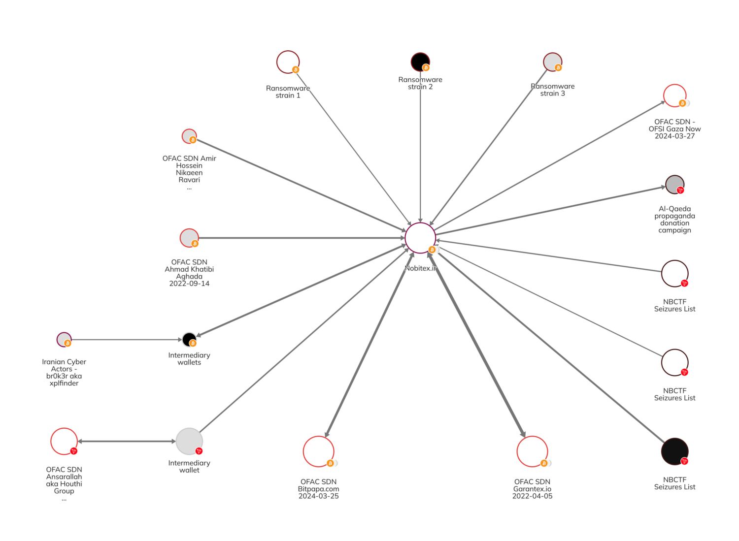 Past on-chain analysis has linked Nobitex to a range of illicit actors, including wallets affiliated with IRGC-affiliated ransomware operators, and entities tied to Houthi and Hamas-affiliated networks as identified by the National Bureau for Counter Terror Financing (NBCTF) of Israel. As we see in the Chainalysis Reactor graph below, the platform has also facilitated transactions with sanctioned pro-Hamas media outlet, Gaza Now, a pro-al-Qaeda propaganda channel; sanctioned Russian crypto exchanges, Garantex and Bitpapa; and many other illicit operators.