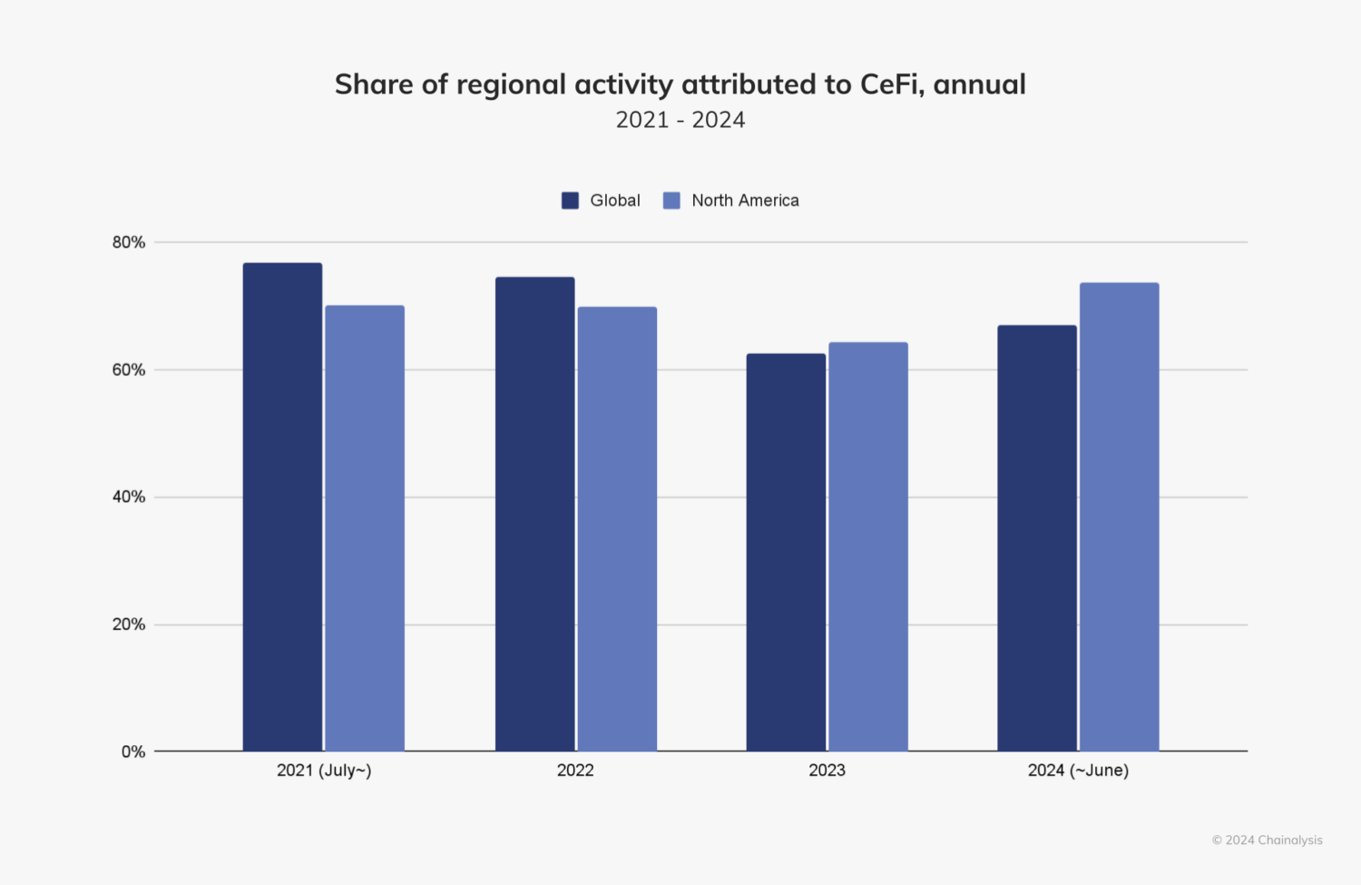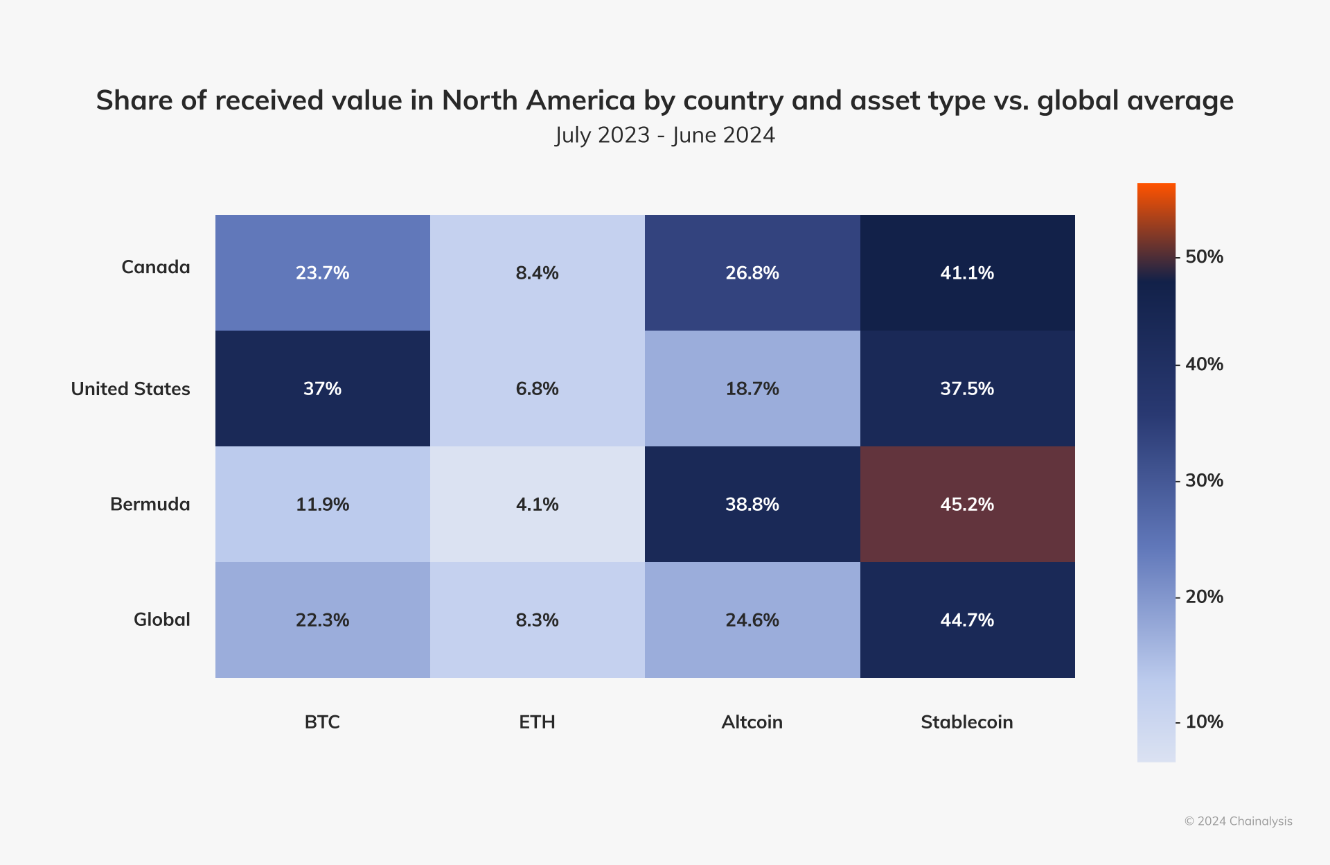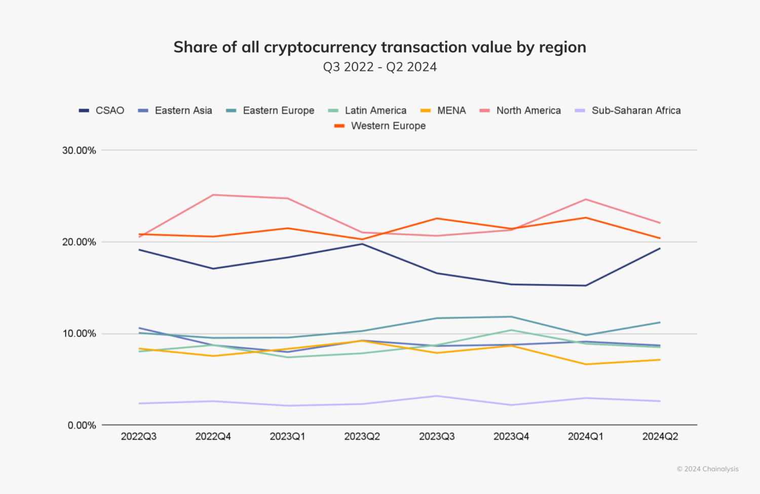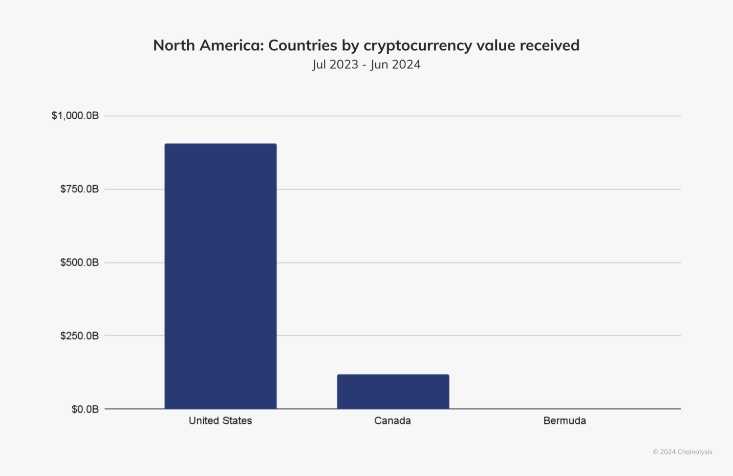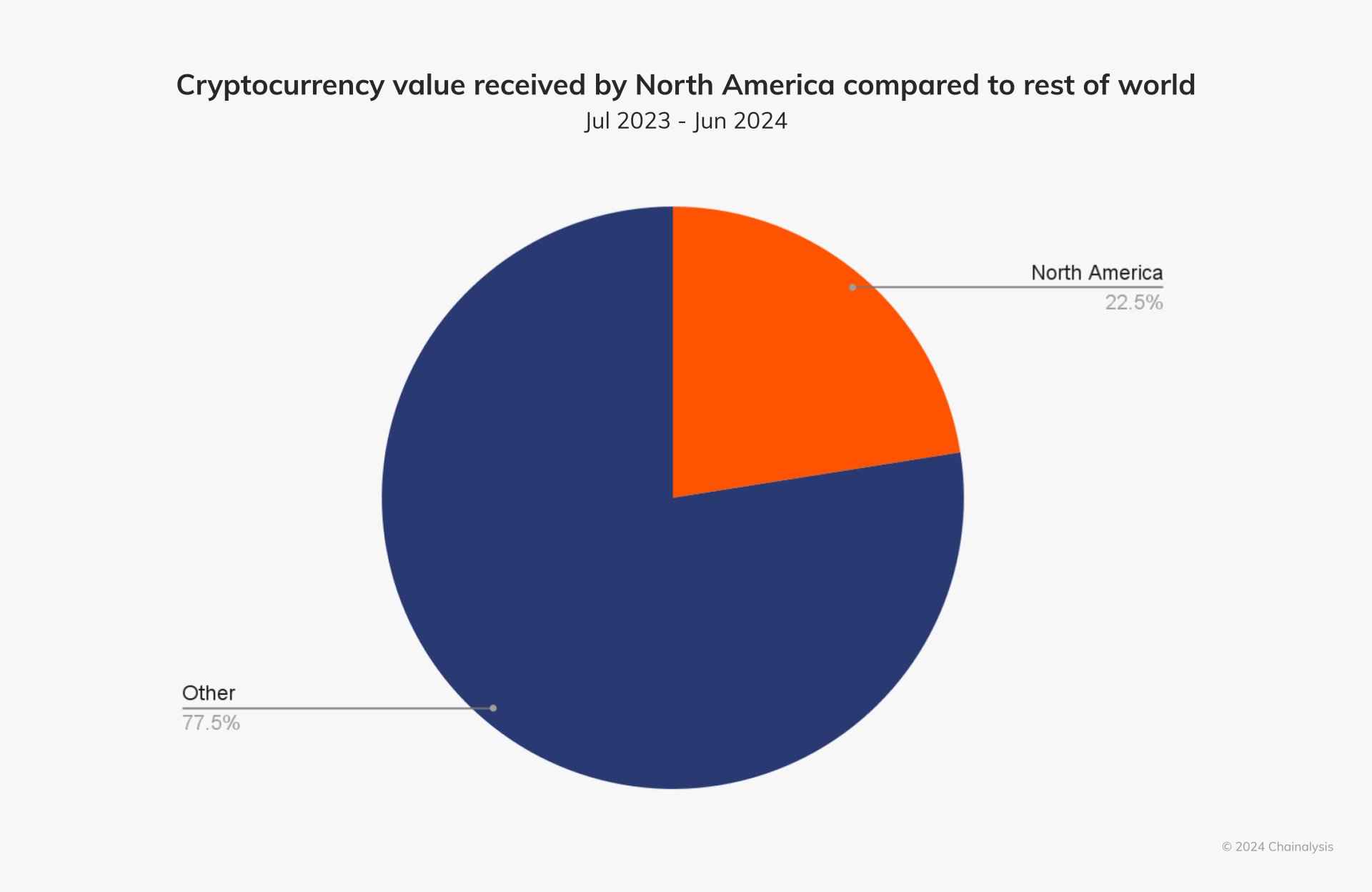 Like previous years, North America remains the largest cryptocurrency market globally, with an estimated $1.3 trillion in on-chain value received between July 2023 and June 2024, representing about 22.5% of global activity.