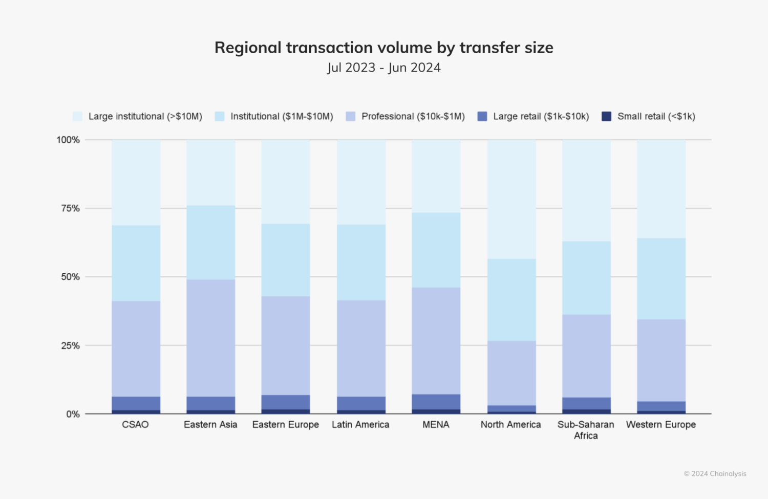 North America’s dominance in the cryptocurrency market is largely fueled by institutional activity — more so than any other region. Approximately 70% of the region’s crypto activity consisted of transfers exceeding $1 million, reflecting the growing influence of major financial players in the region’s crypto market.