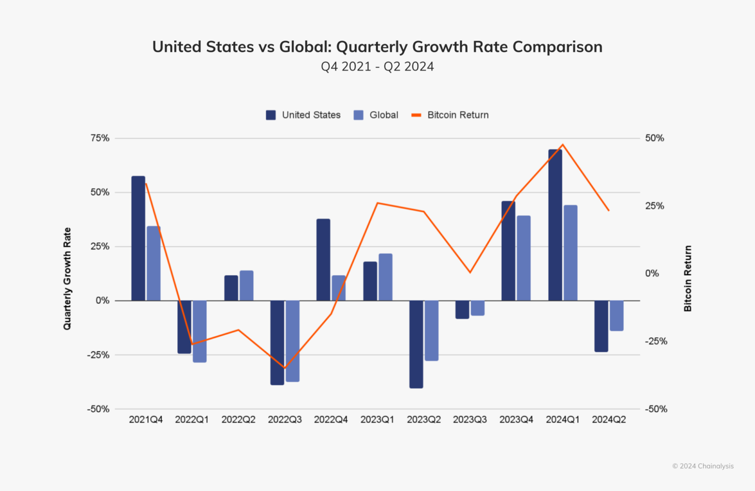 U.S. markets are notably more volatile than global markets in terms of growth. In recent quarters, the U.S. has demonstrated heightened sensitivity to both bull and bear markets. When cryptocurrency prices rise, the U.S. market shows larger increases in growth than the global market — and the inverse is true when cryptocurrency markets decline. We can see this movement below, comparing the rate of growth in U.S. and global markets with returns on bitcoin.