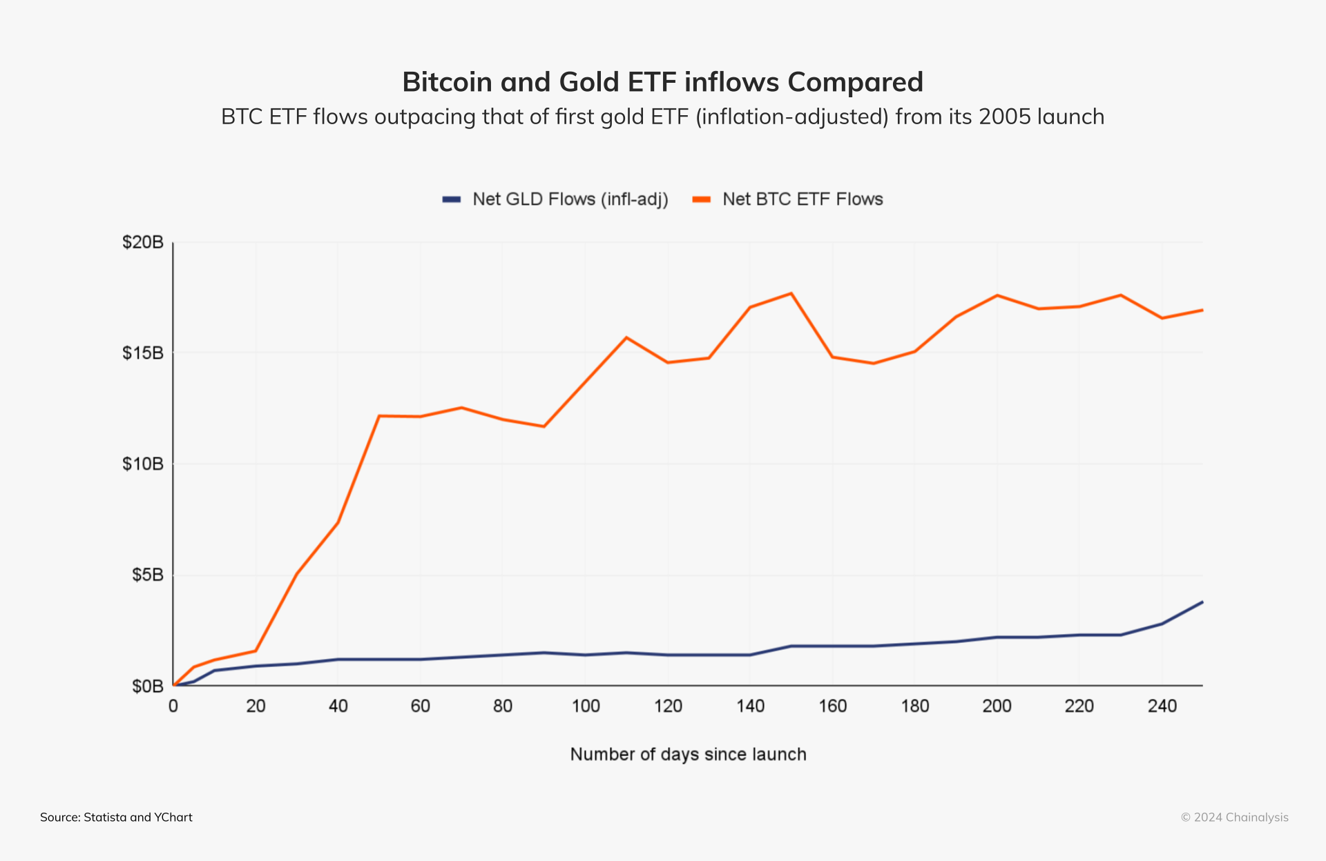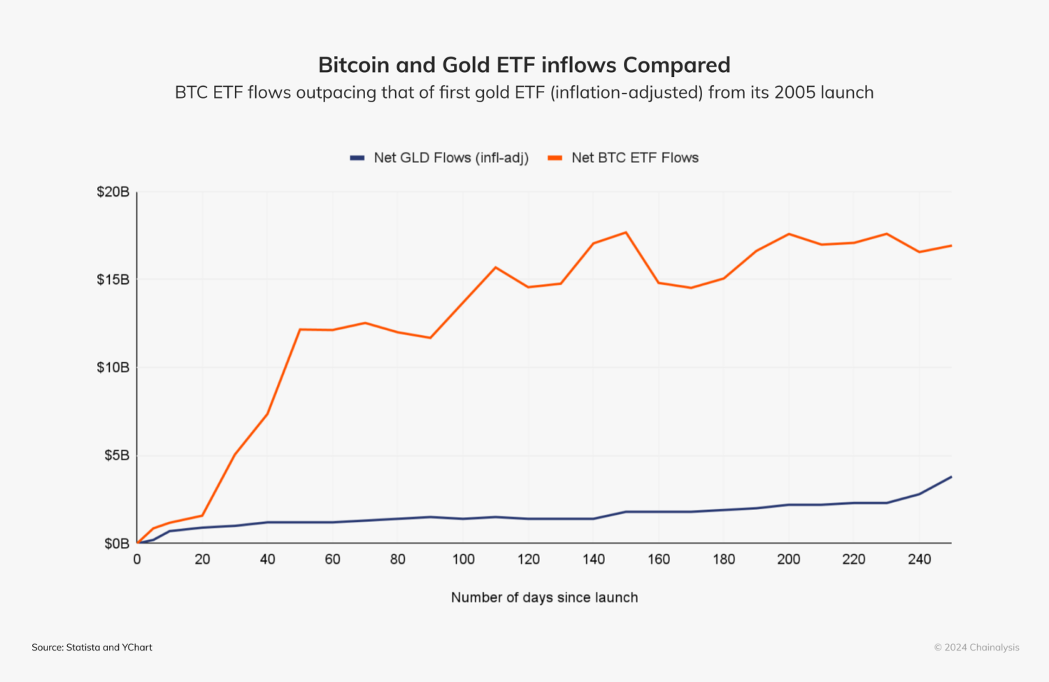Within its first two hundred days, inflows to the U.S. bitcoin ETFs wildly outpaced even the historically popular gold ETF, making it the most popular class of ETP in history.