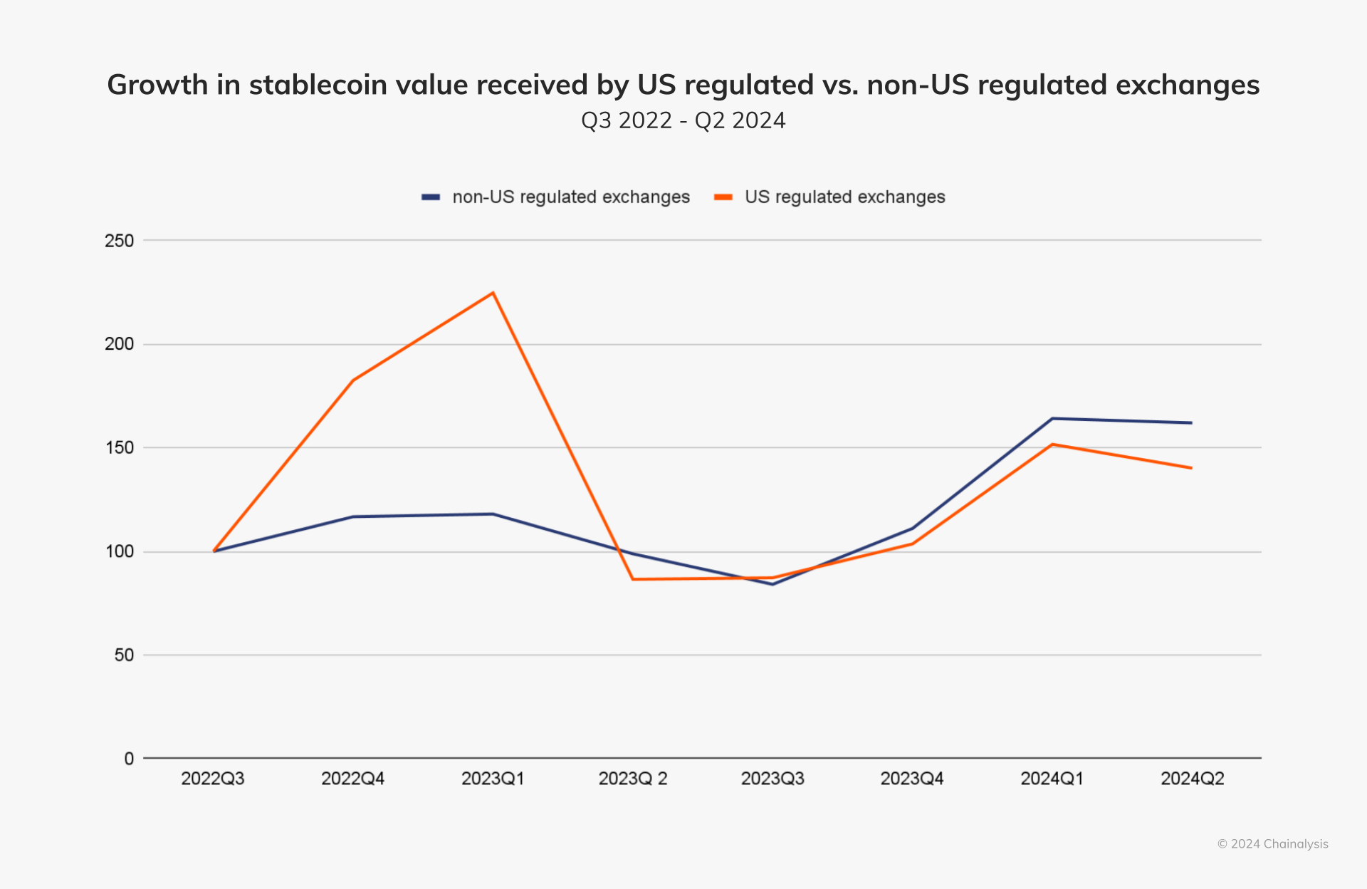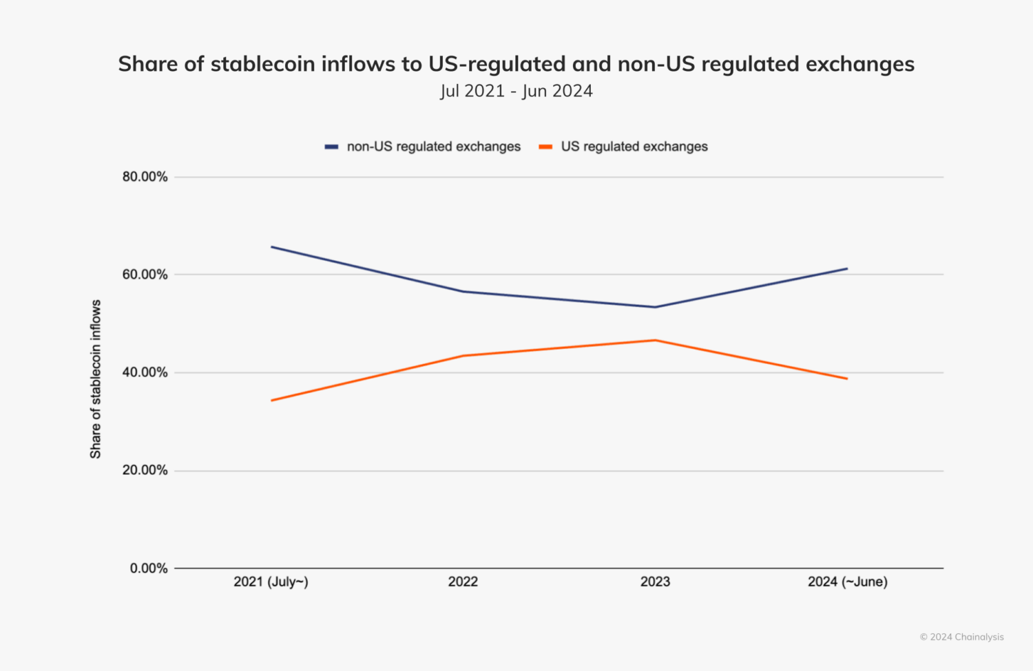 Up through 2023, the share of stablecoin transactions on U.S.-regulated exchanges had been steadily increasing, consistent with increased stablecoin adoption globally. However, in 2024, this trend began to reverse, as we see below.