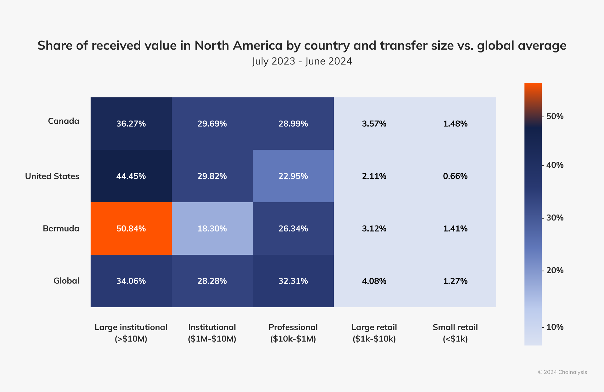 Across the board, Canada tracks closely with global averages in asset distribution and transaction sizes.