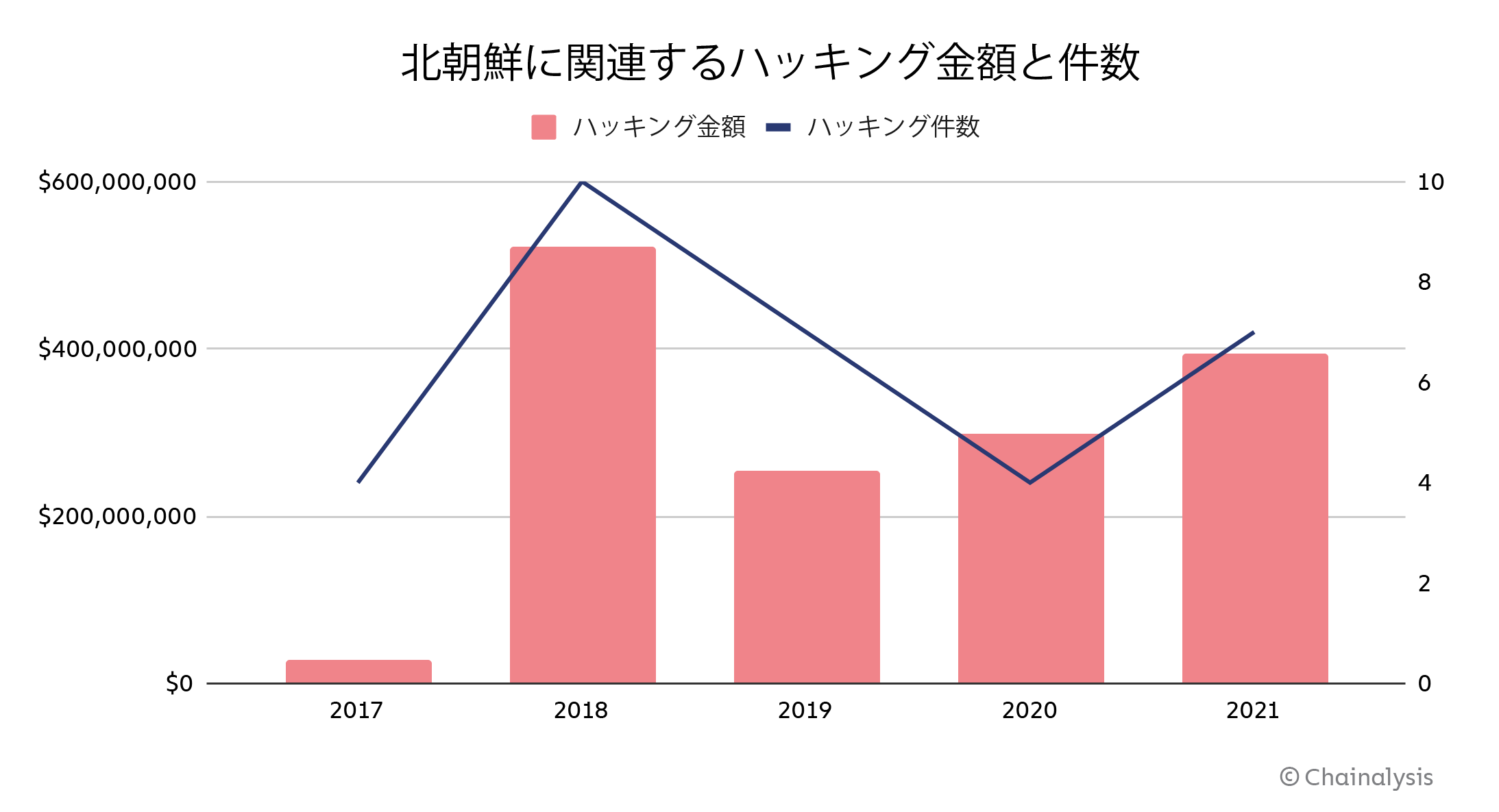 北朝鮮のハッキング活動は、2021年に再び活性化しました。2020年から2021年にかけて、北朝鮮に関連するハッキング数は4件から7件に跳ね上がり、それに伴う流出価値も40%上昇しました。