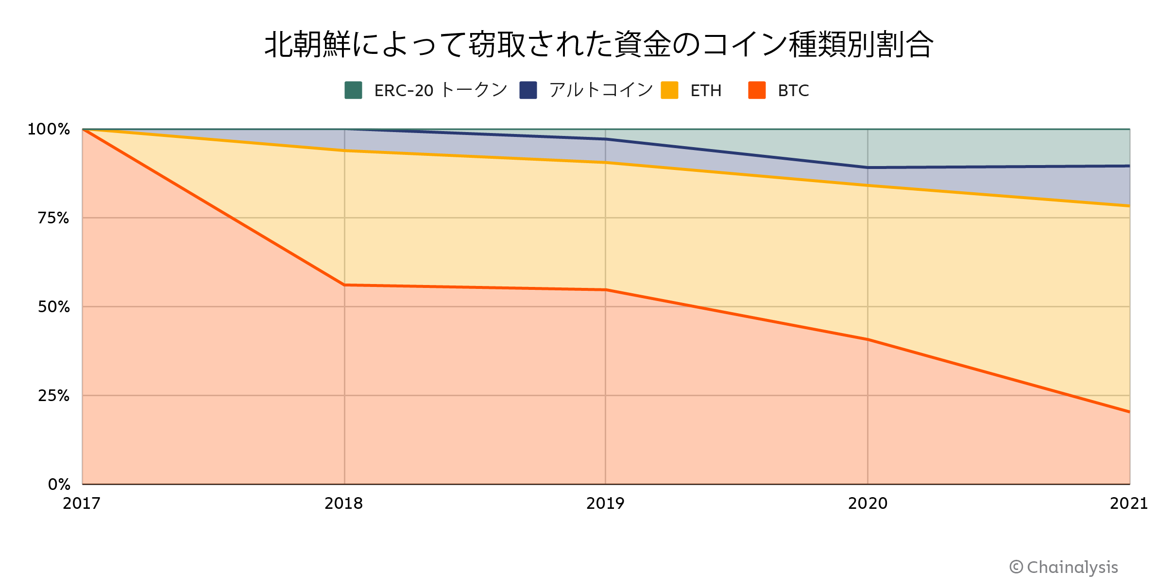 興味深いのは、北朝鮮によって窃取された暗号資産内でビットコインの占める割合が、ドルベースで言えば1/4未満に過ぎなかった点です。2021年に窃取された資金の内、ビットコインはわずか20%で、22%がERC-20トークンまたはアルトコインのいずれかでした。そしてEtherが初めて大半を占め、窃取された資金の58%となりました。