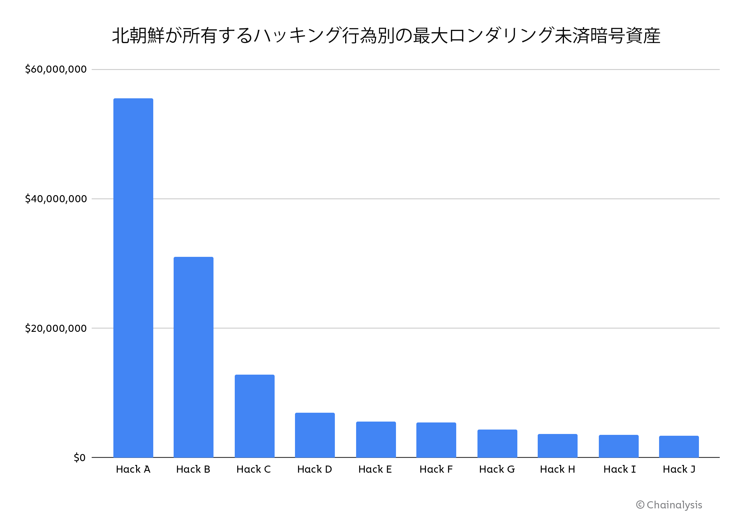 Chainalysisは、北朝鮮が2017年から2021年までに行った計49回のハッキングで窃取され、北朝鮮のコントロール下にある資金のうち、サービスを使ったロンダリングが未済の残高が1億7,000万ドル存在すると特定しています。ドル換算価値でトップ10の残高を以下に示します。