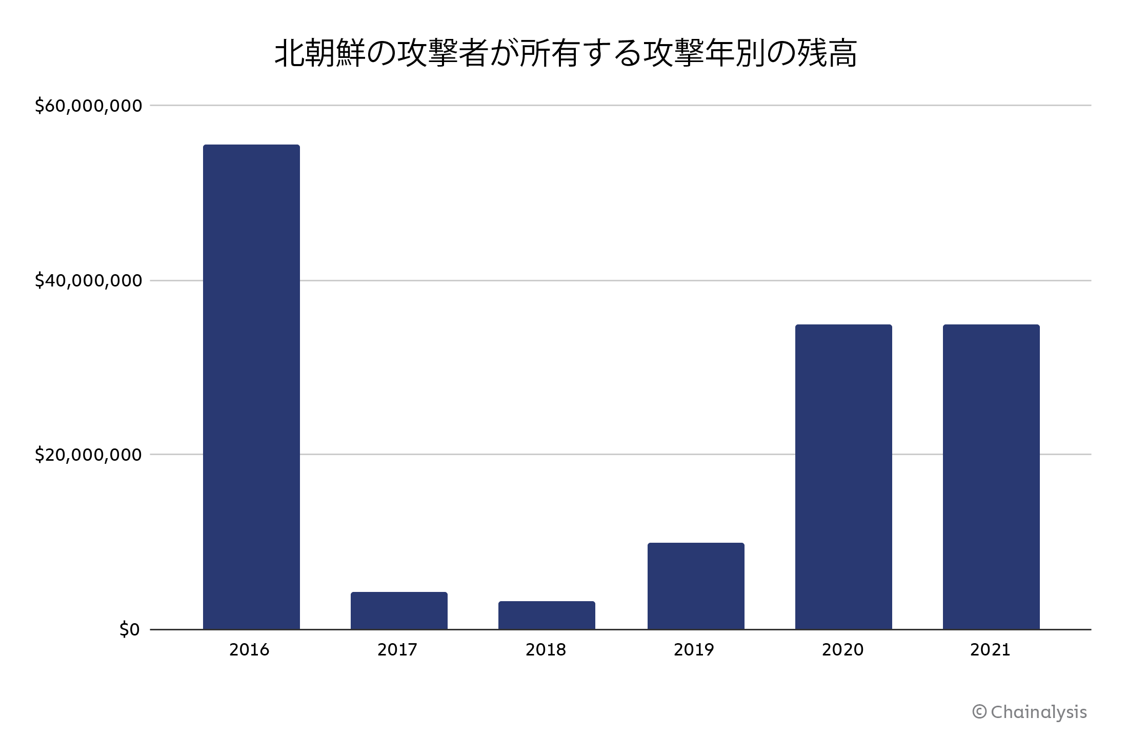 北朝鮮の総所有額のうち約3,500万ドルは、2020年と2021年の攻撃によるものです。一方、5,500万ドル以上が2016年の攻撃によるもので、これは北朝鮮が6年ほど前のロンダリング未済の大量の残高を保有していることを意味します。