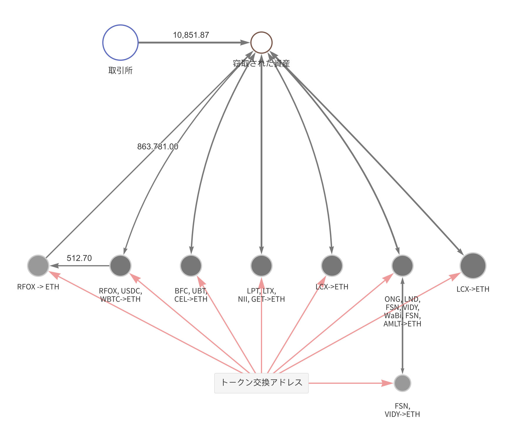 次に攻撃者は、分散型プロトコルを使って様々なERC-20トークンをEtherに交換しています。さらに、Etherをミキシングし、それをビットコインに交換して、ミキシング済みのビットコインを新しいウォレットに集約した上で、アジアを拠点とする暗号資産から法定通貨への換金取引所に入金しました。この結果、約9,135万ドルの暗号資産がロンダリングされたことになります。