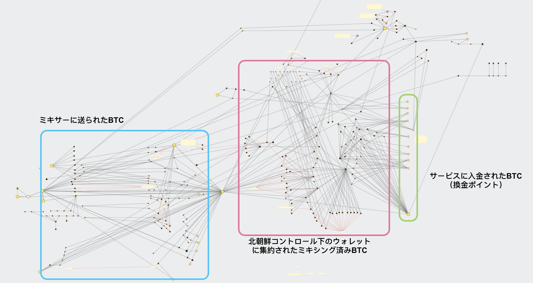 なぜミキサーが使用されるのか? ミキサーは、数千のアドレスから得られた暗号資産をプールし混ぜこぜにするソフトウェアツールです。北朝鮮は複数のミキサーを使い、体系的にマネーロンダリングを行うことによって、法定通貨に換金する際に、不正に取得した暗号資産がどこから来たのかを分からなくさせようと企てているのです。