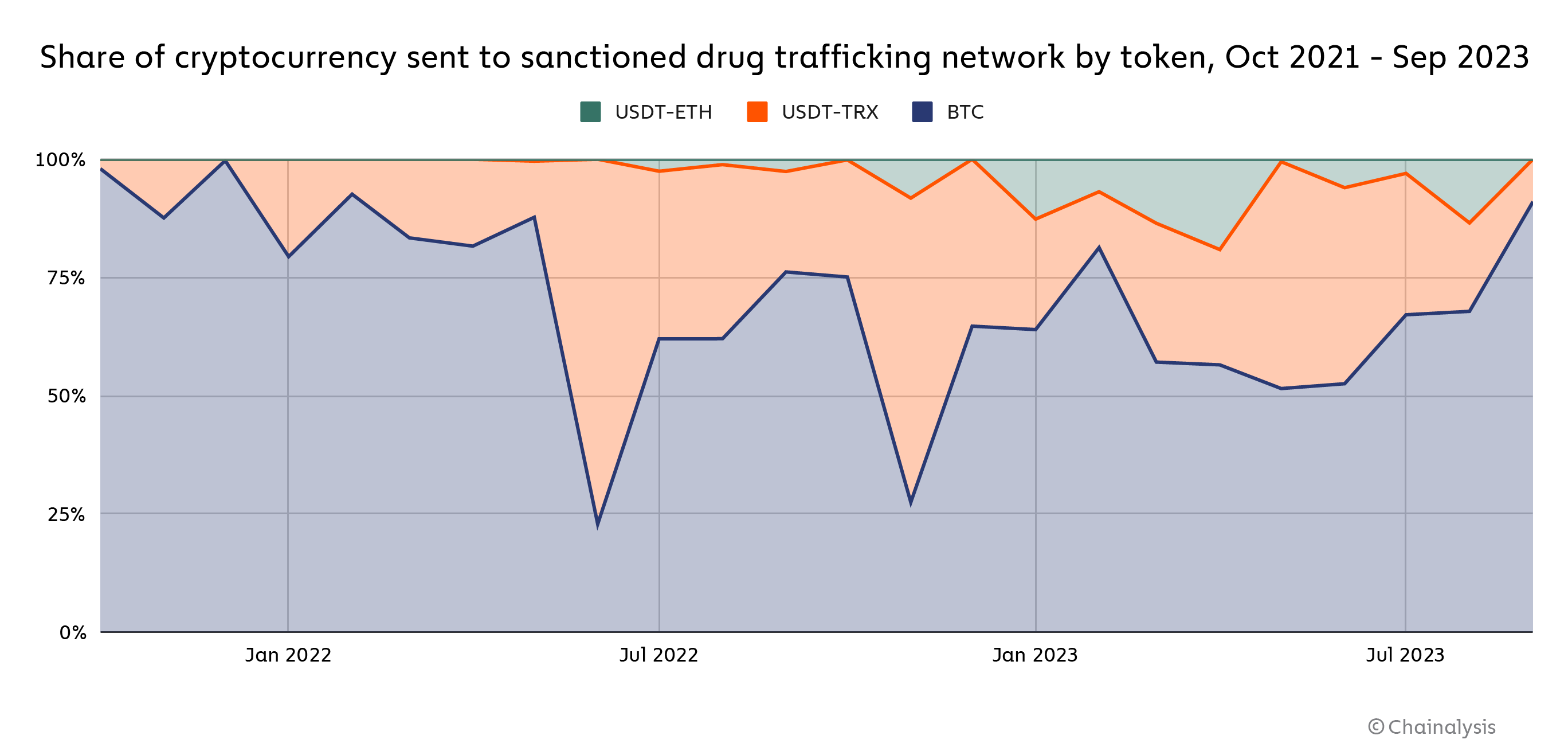 Moving back to the on-chain world, if we look at the aggregate activity of all the addresses associated with sanctioned entities within this drug trafficking network, we see the use of Tron in addition to Bitcoin.