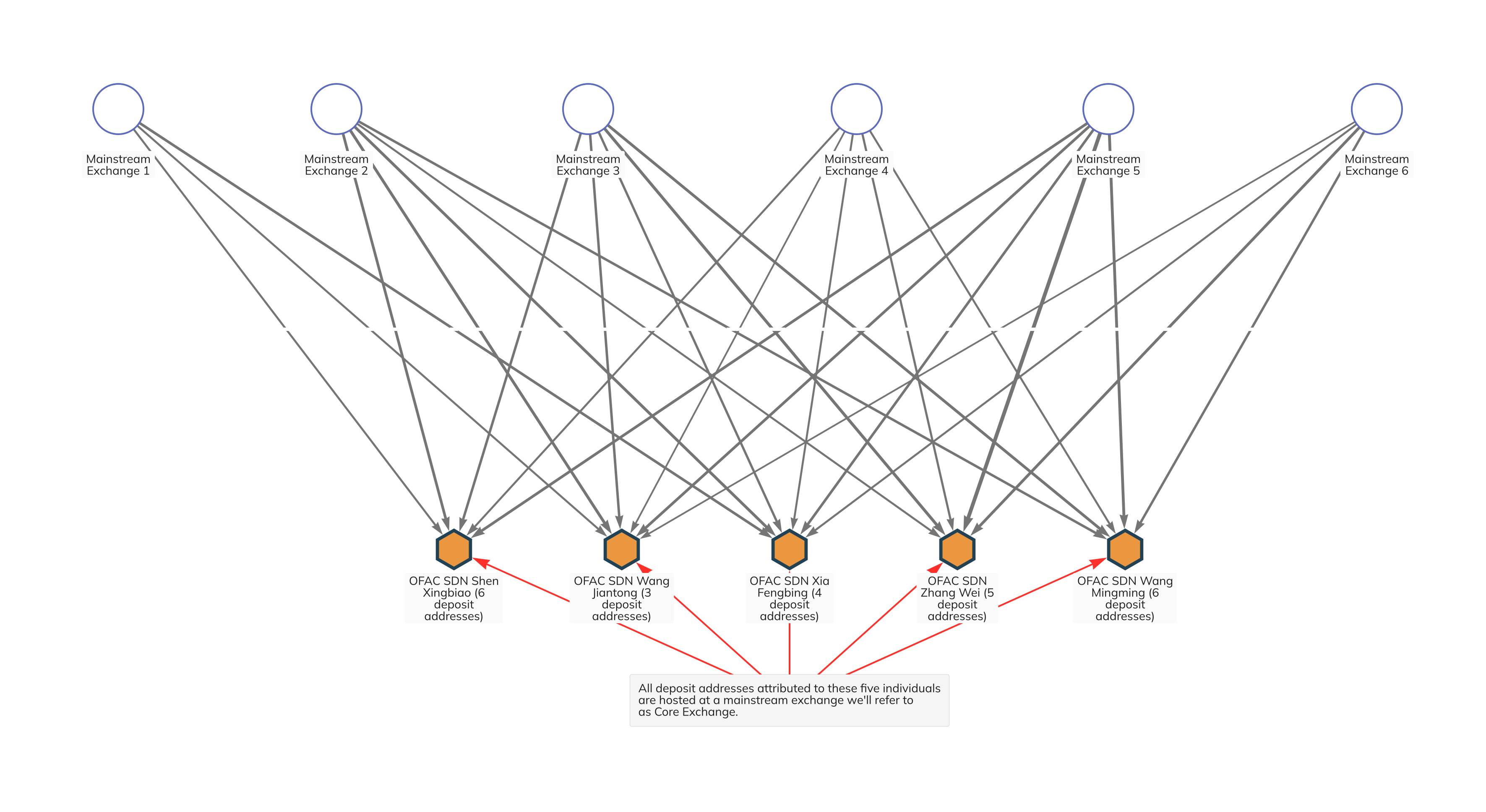 The cryptocurrency addresses associated with individuals and companies designated by OFAC in this round of sanctions span the Bitcoin, Ethereum, and Tron blockchains. Addresses on the latter two blockchains primarily received stablecoins supported by those blockchains, such as USDT and USDC. With the exception of addresses controlled by Valerian Labs, all of the addresses were hosted at one mainstream exchange, which we refer to here as Core Exchange. Those addresses received funds from both personal wallets and mainstream exchanges — more specifically, they received funds primarily from six other mainstream exchanges, as we see on the Chainalysis Reactor graph below