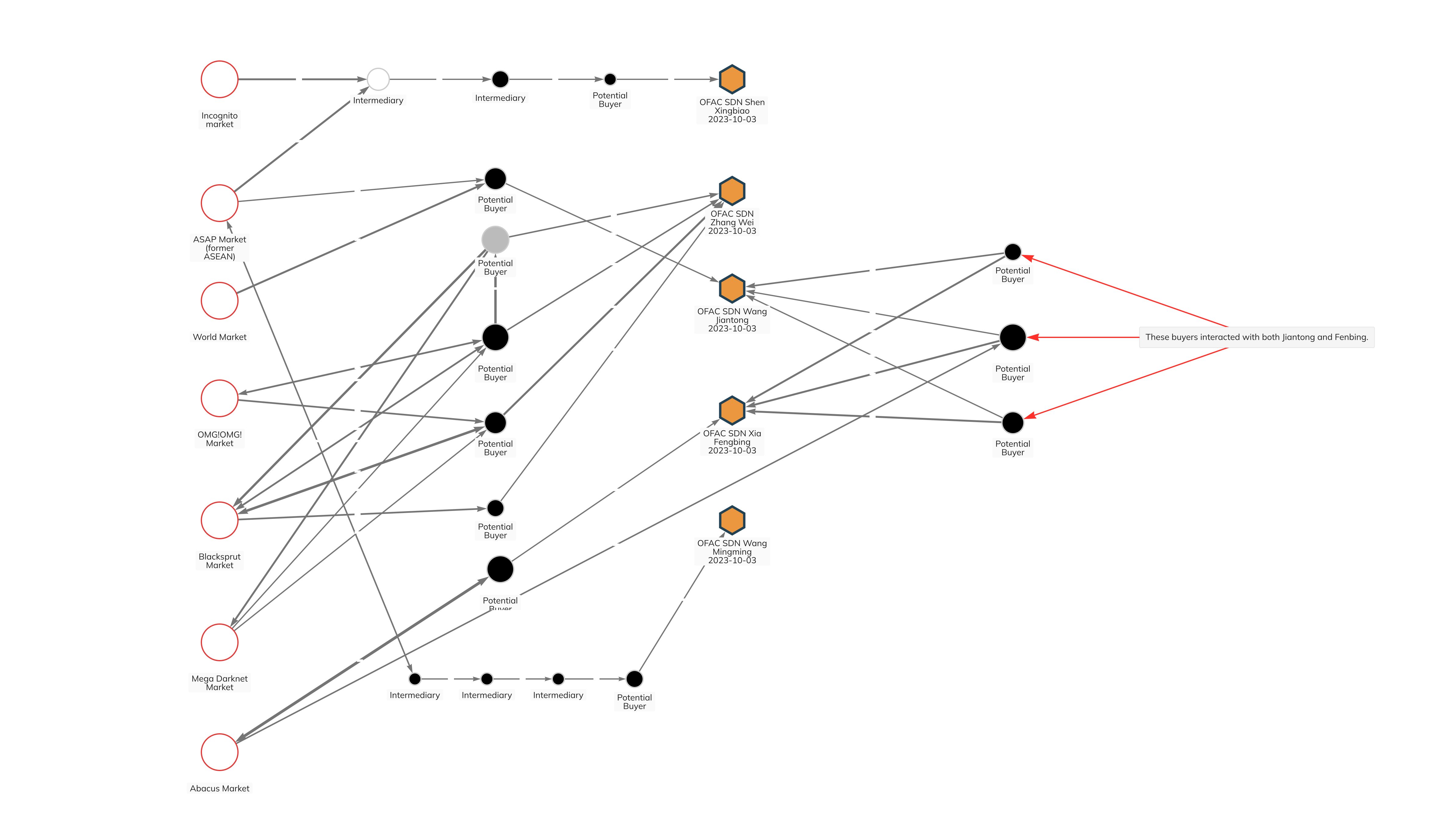 Several of the most prominent darknet markets currently operating sent significant funds to some of the addresses identified in this round of sanctions, including Mega Market, OMG!OMG! Market, and Blacksprut. In all cases, those funds were first sent to intermediary wallets prior to reaching the sanctioned entities.