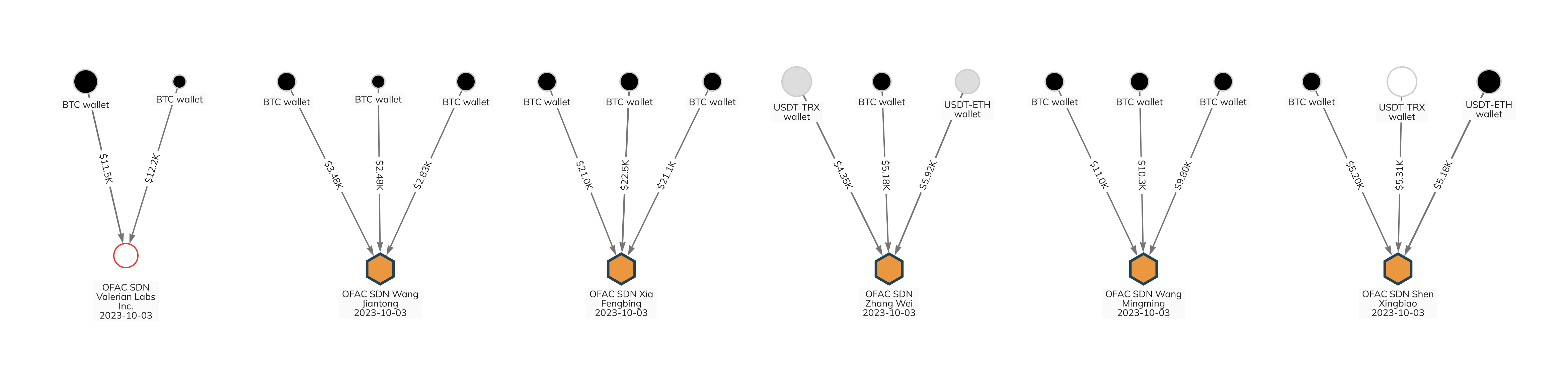 Each of the five individuals referenced above received hundreds of thousands of dollars’ worth of cryptocurrency each to their respective deposit addresses at Core Exchange. The individuals reached those totals not through a few large transactions, but through many smaller transactions in consistent amounts, an indication of the sale of specific goods — in this case, fentanyl and associated precursor chemicals. We can see this on the screenshot below, which shows a subset of the transactions between the deposit addresses shown above and various personal wallets. Valerian Labs’ sanctioned addresses are also included — while Valerian was less active than the others, its incoming transactions follow a similar pattern.