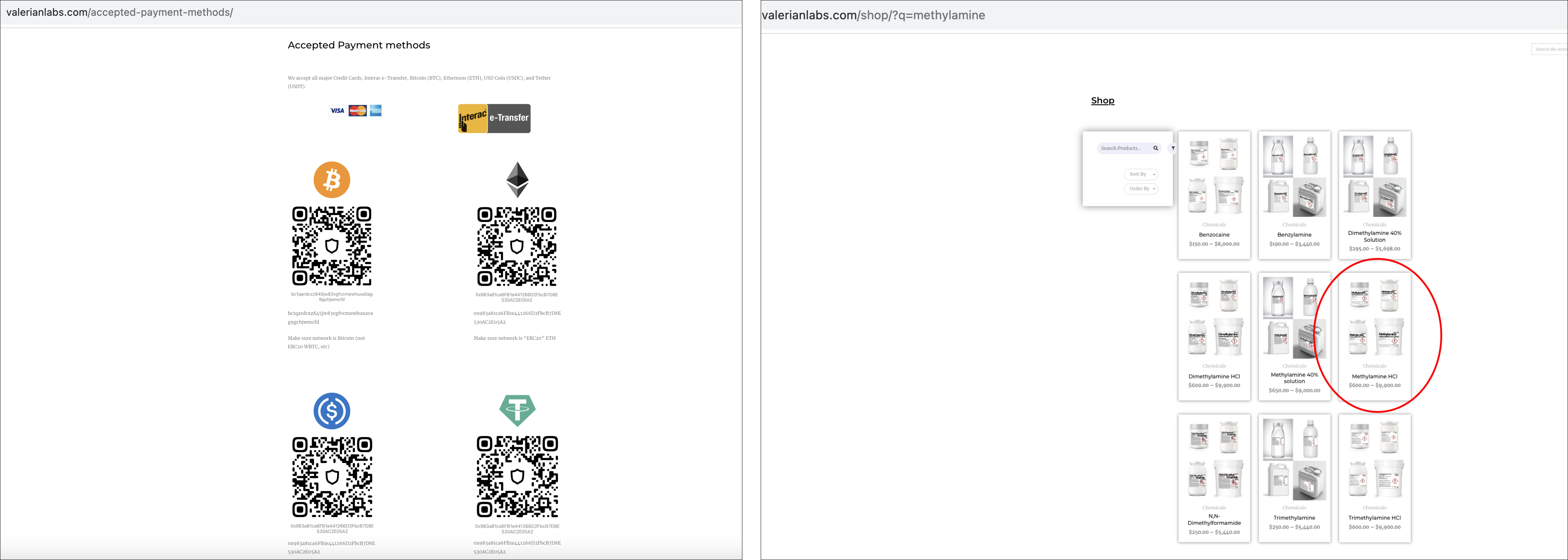The first screenshot shows Valerian’s cryptocurrency payment page, which directs users to send crypto to the addresses included in OFAC’s designation of the company. The second screenshot shows some of the products Valerian had for sale, including methylamine hydrochloride, a precursor chemical that can be used to make drugs like methamphetamine and MDMA. OFAC cites Valerian as having received shipments of this controlled substance in its press release.