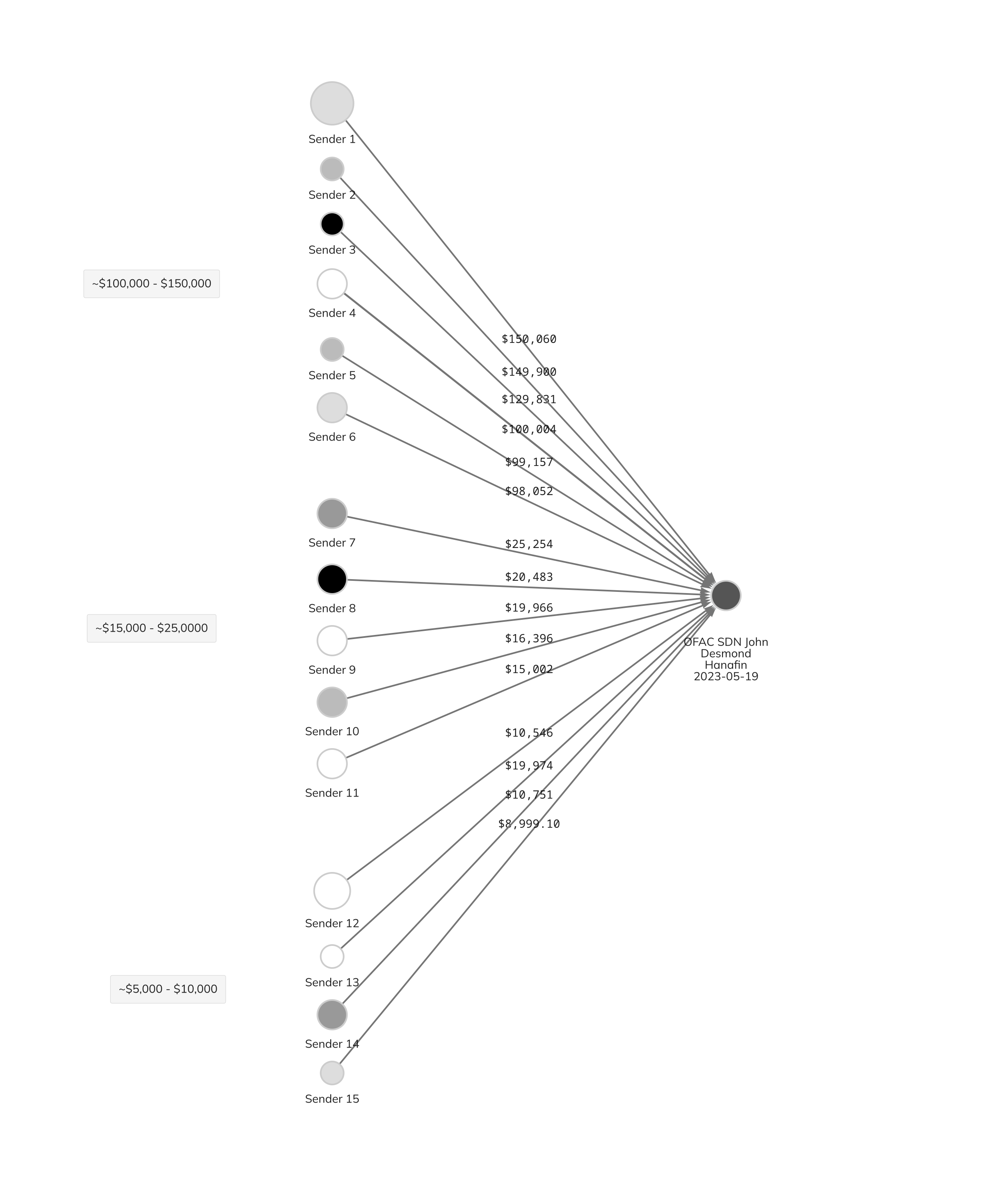 One thing that stands out in analyzing Hanafin’s received transactions is the consistency with which transactions of certain sizes occur. Across the 75 USDT transactions received by Hanafin, we see several in amounts within the following ranges: