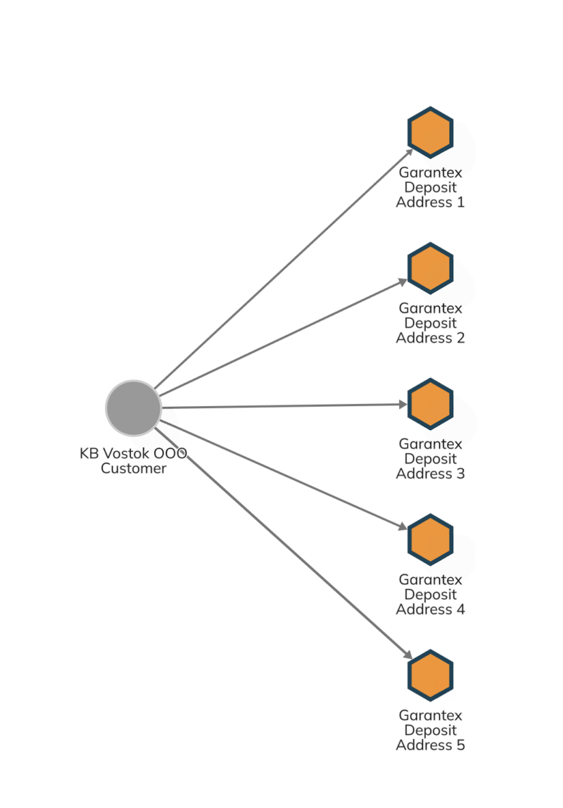 Additionally, the counterparty has used multiple deposit addresses at the sanctioned Russian exchange Garantex. These deposit addresses cumulatively processed more than $100 million in USDT, indicating that if this wallet’s owner is affiliated with Russia’s military supply chain, they are leveraging Garantex extensively to facilitate the activity, as seen below.