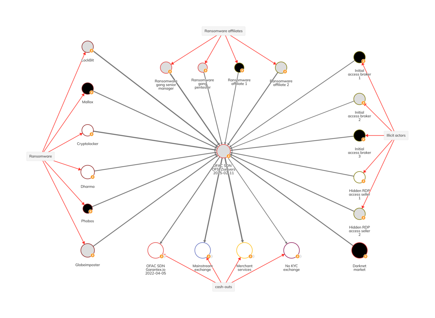 OFACは、ロシア国籍のAleksandr Sergeyeevich BolshakovとAlexander Igorevich Mishin(Mishinに関連する暗号資産アドレス1件を含む)およびZservers自体(Zserversに関連する暗号資産アドレス3件を含む)を特別指定国民および資格停止者(SDN)リストに追加しました。OFACの指定には、ダークウェブのフォーラムでZserversのサービスを宣伝するために使用された別名も含まれています。