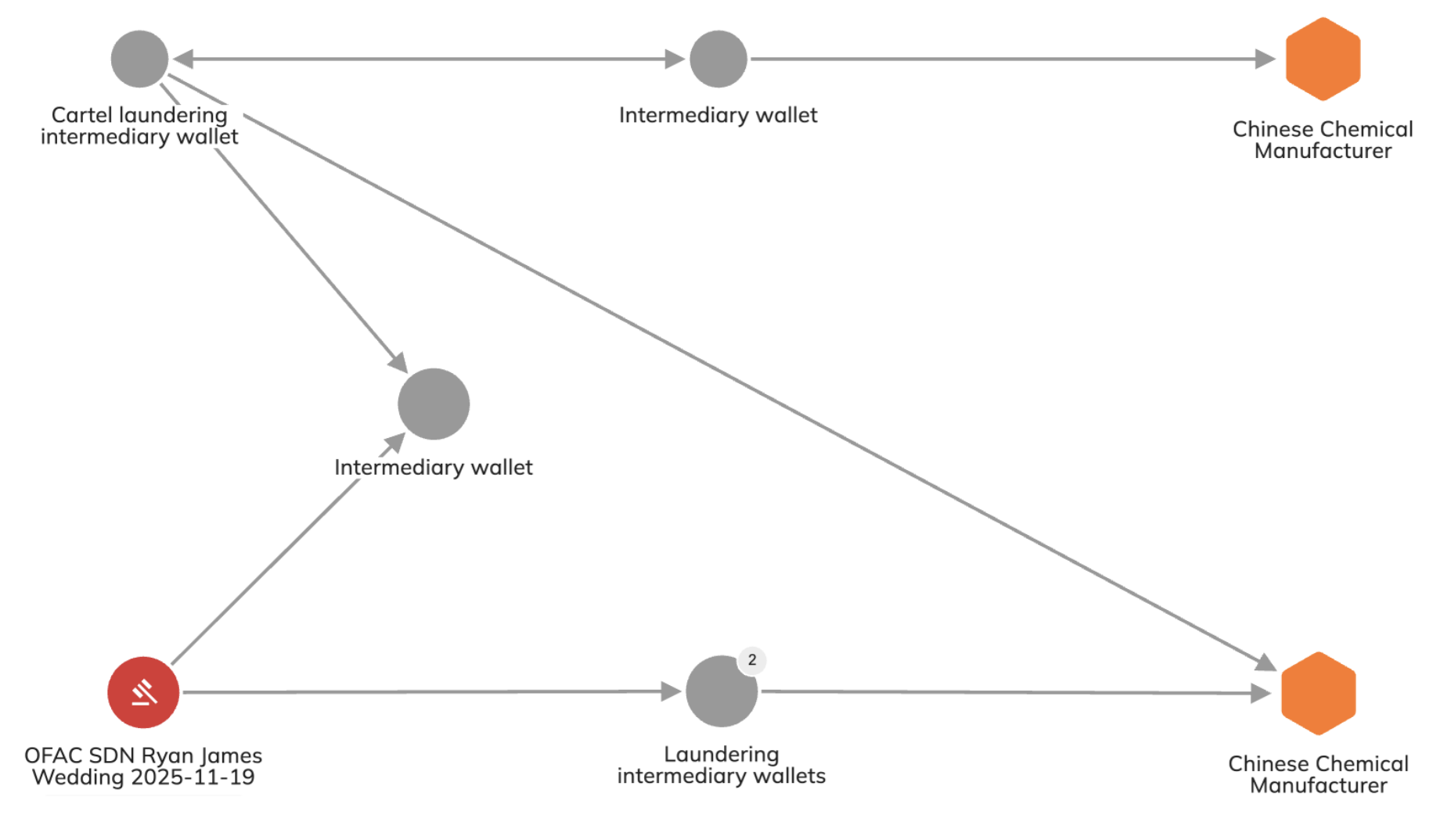 Three TRX addresses belonging to Wedding were included in OFAC’s designations. Overall, Wedding received over 263 million dollars worth of USDT_TRX. As shown in the graph below, these wallets have indirect ties to China-based chemical manufacturers identified by Chainalysis. Further, there were close connections to other intermediary laundering wallets that have been involved in cartel-related laundering activities.
