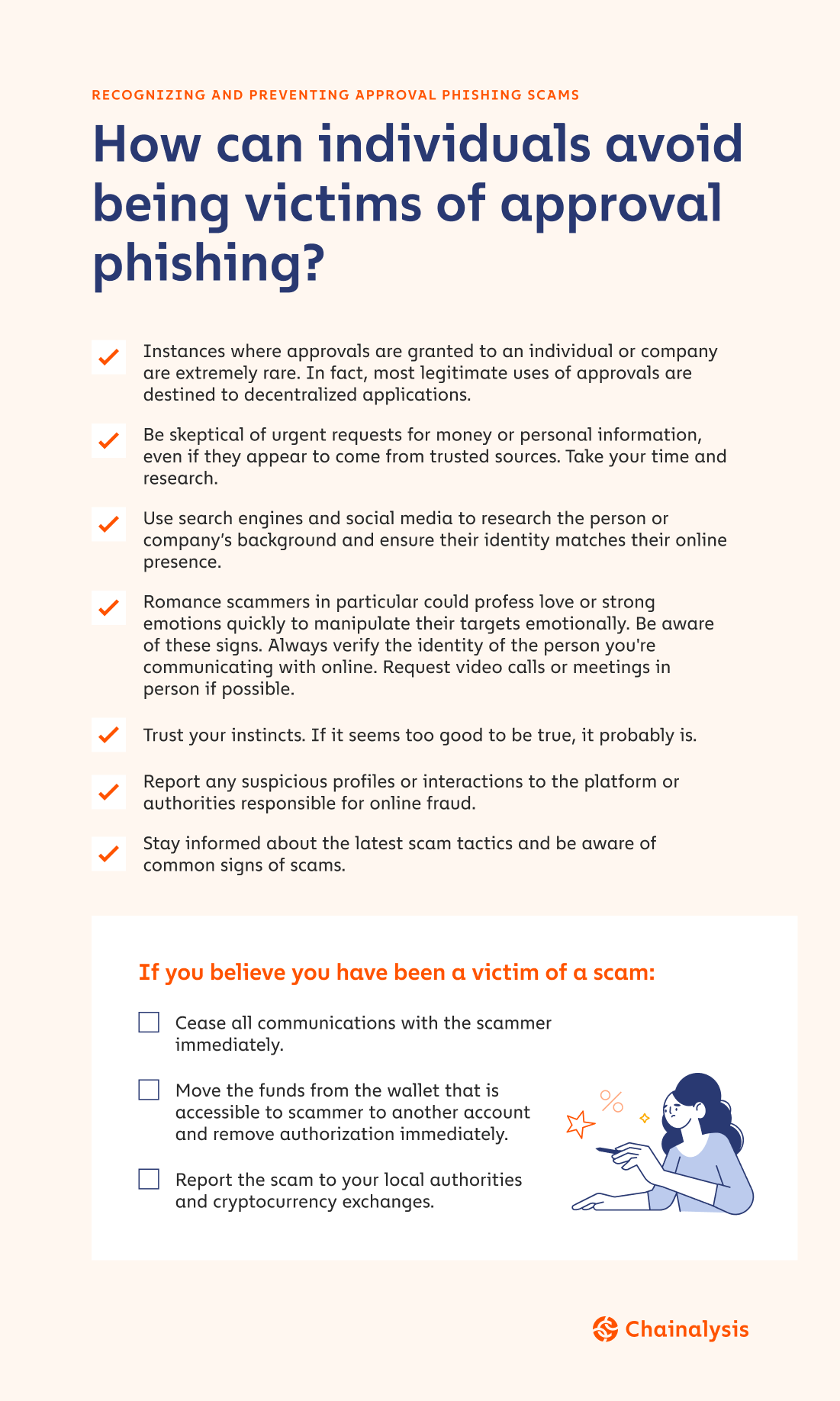 - Public education and user awareness: Preventive efforts such as education plays a critical role as the first line of defence against scams. Cryptocurrency users should note that instances where approvals are granted to an individual or company are extremely rare. In fact, most legitimate uses of approvals are destined to decentralized applications.