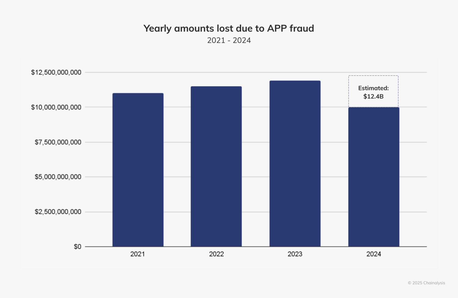 As we recently revealed in our 2025 Crypto Crime Report, nearly $10 billion worth of crypto was lost in 2024 due to various APP scams, although we estimate this number is likely closer to $12.4 billion, which would be a slight increase from amounts stolen in 2023.